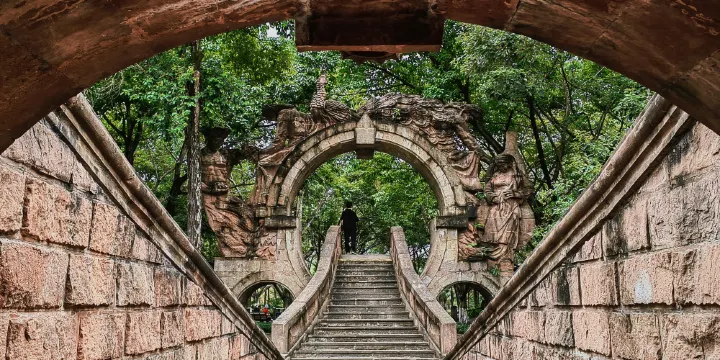 石刻藝術牆坐落在德陽市內泰山北路幹道旁,由牛門、生命之歌、藝術長廊、智慧之光、中華魂、十二生肖大柱等景觀組成,以自然、生命為表現主題。德陽市的能工巧匠們巧妙地將地形環境作藝術處理,集思廣益,構思繪製藍圖並建成了這座與石牛公園配套的大型石刻藝術牆,在中國開了城市擋土牆建築與造型藝術有機結合之先河,集民族、傳統文化內涵,充分展示地方性和時代性。特別流連的是首尾兩組大型浮雕,牆北端長38米的大型浮雕《生命之歌》,由“四季”、“飛馬躍瀑”、“人與自然”三部分組成,表現出人類與自然原本和諧的關係,以及對生命的渴救與謳歌。牆尾長53米的一組鏤空壁雕《智慧之光》,以及漢代畫像造型,集中展示了巴蜀文化的燦爛。