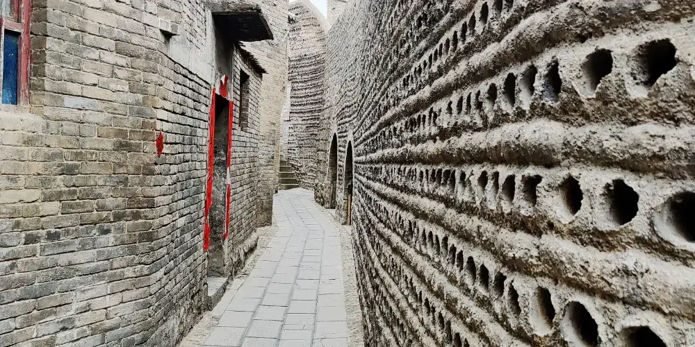 砥洎城建在一座小山咀上,其南接村鎮,北臨沁河,三面環水,呈半島狀。遠望其城,堅如磐石的砥柱挺立中流,故名砥洎城。該城建築年代已不可考,但從明崇禎十一年(1638年)“山城一覽”碑碣得知,其創始年代應在明末以前。城呈橢圓形,磚砌,佔地面積約六萬平方米。南有正門,起於地面的城牆,高約十米。臨河城牆從河邊築起,高約20餘米,上設城垛、炮台等,是用來防備外來之敵的,現已毀壞不存。正門額書“砥洎城”,為城內居民出人之通道;城北沿城牆設石梯,沿梯而下可通水門乘舟而行。城內道路規則,城周築環城路,其餘均為住宅巷道,各種設施齊備。古時一遇兵荒馬亂,城門一關,自成一體,攻不可破。城內民居共分十大街坊,擺佈井然有序,住宅之間每自巷頂架設過街樓相通,人行方便。這些房屋多為單進式二進院,院中房屋多為雙層,大部分設有樓道。民居門額皆為“XX居”字樣,很有點文雅之派頭。其中一座“有恆居”,木石建築工藝精細,四樑八柱,四門八窗,極具民俗特色。