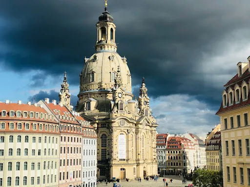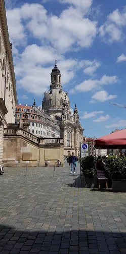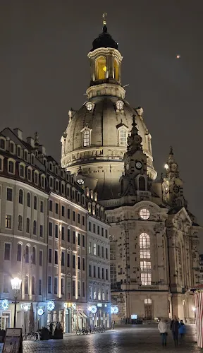 德累斯頓聖母大教堂始建於1726年,採用了圓形拱頂、砂岩拼建等前所未有的建築方式,是由木匠大師奧爾格·貝爾主持設計修建的,曆時17年方才建成。聖母大教堂高95米,規模巨大,精巧華麗,是西方新式教堂建築的代表作,是這座古老城市的標誌性建築,也是德累斯頓最亮麗的風景,有許多音樂大師和藝術大師在這裡留下了他們的足跡。