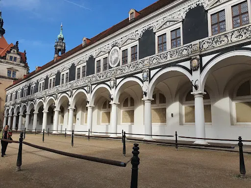 除了宮殿內的各式展品外,位於北側靠Augustus路的外牆面上的壁畫也是不容錯過,在這座長達102公尺的牆上,以磁磚鑲嵌畫的方式繪有一高8米長的綿長壁畫——《君主的行列》(Der Furstenzug),圖中的人物即撒克森曆代君王的騎馬像;使用的磁磚多達2萬7000多塊,始造於19世紀末、完成於20世紀初,是整座王宮在二次大戰倖存下來的少數原物之一。