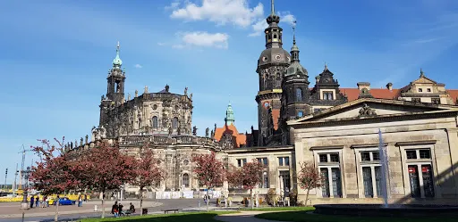德累斯頓王宮是德國最為恢弘、重要的宮殿建築之一,1485年起便是曆代撒克森王國統家族的居住地,也是當時該地區的政治權力中心。宮殿在二戰中曾一度毀於戰火,之後按照原貌複原重建。這座宮殿建築融合了多種建築藝術風格,鵝黃色的外牆配上紅色屋頂和青銅色的圓頂,頗為雍容華貴。新建的封閉中庭的玻璃球形穹頂十分特別,這裡設有售票處、紀念品商店、咖啡館,免去遊客以往須在露天排隊等待的困擾。