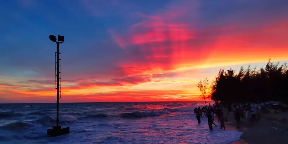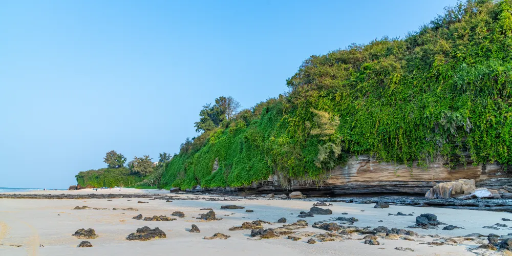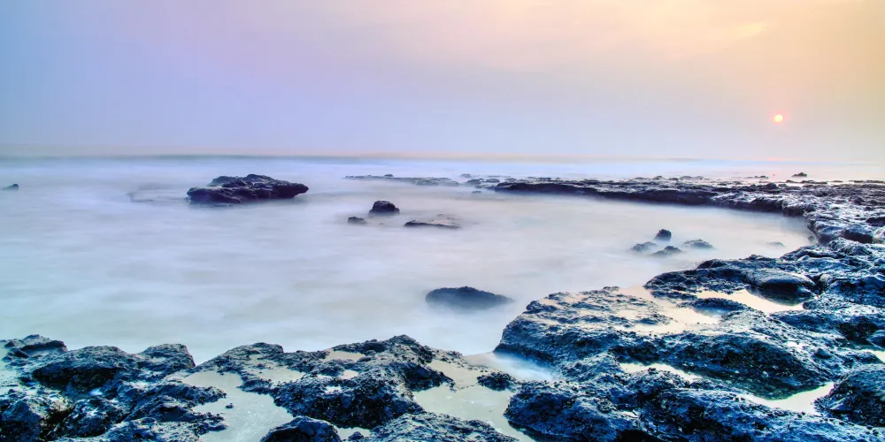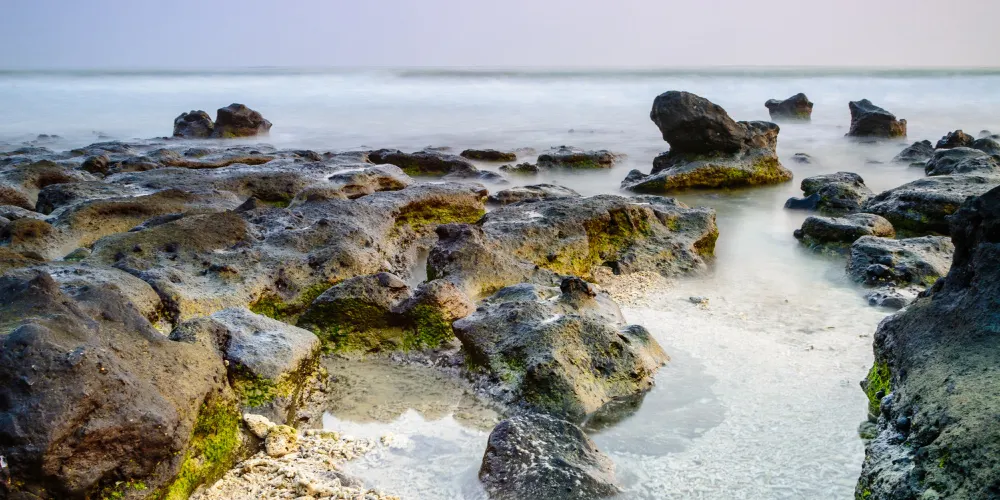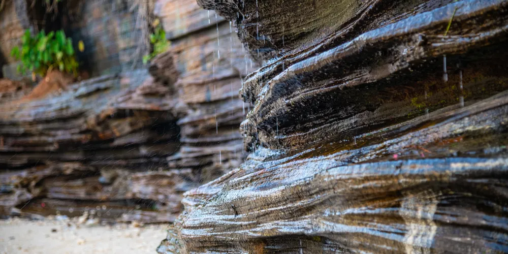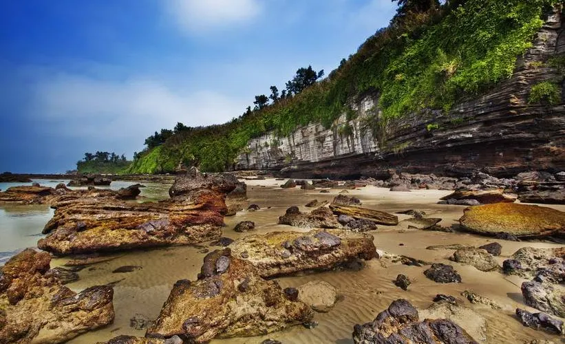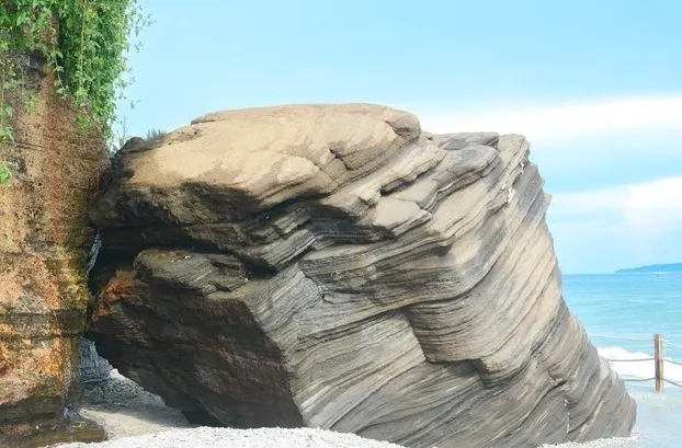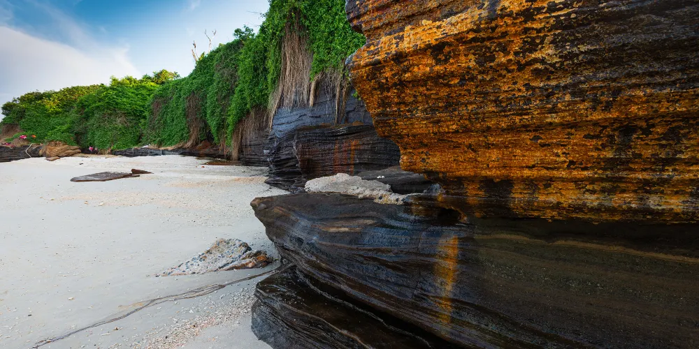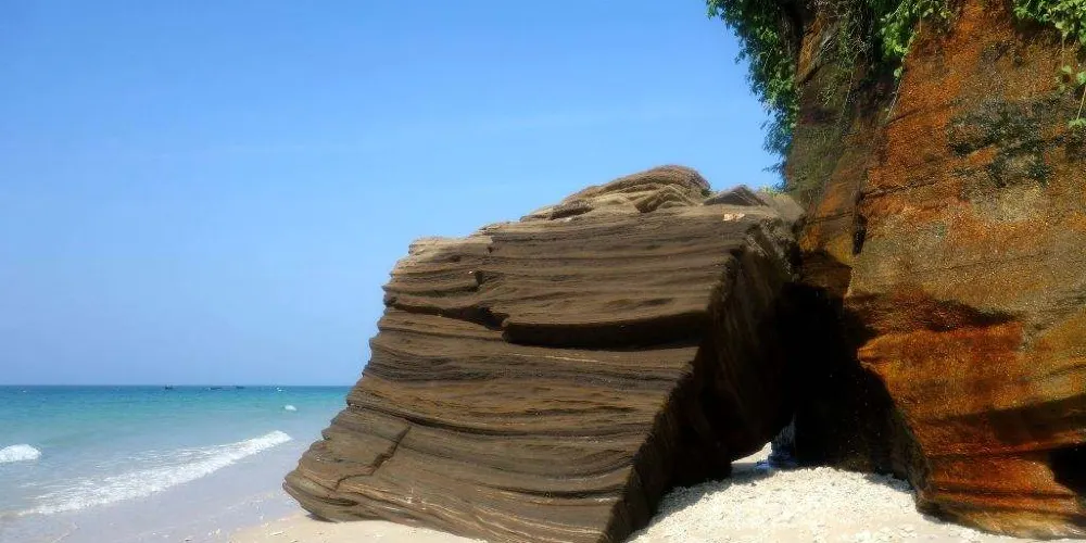 滴水丹屏是位於潿洲島西南部的一段海邊石崖,崖壁上的石縫間常有水滴滴落,所以也叫滴水岩。滴水丹屏擁有層疊的海蝕紋理,是觀賞日落的絕佳之地。此外,滴水丹屏的海灘也非常不錯。靠近水邊的沙子很細膩,中間鋪滿了碎珊瑚,再往岸邊就是松樹林,在海灘上走走很愜意。