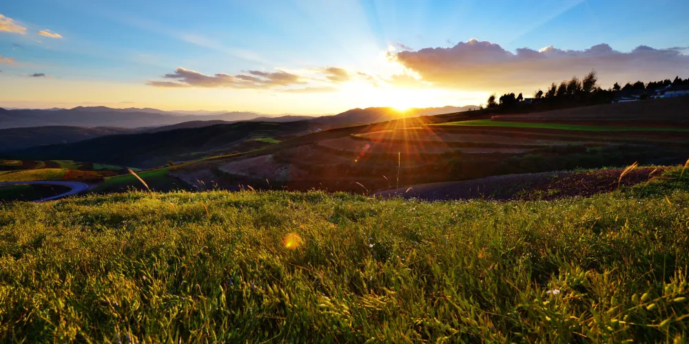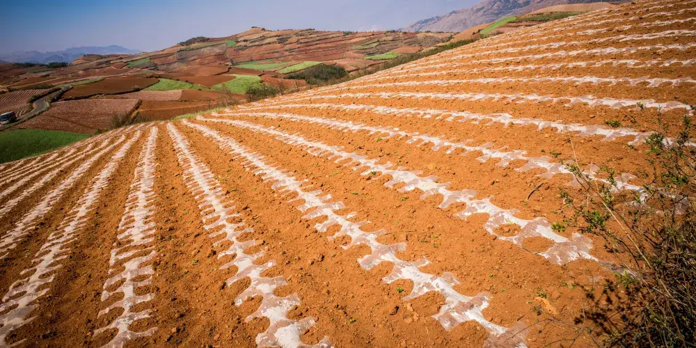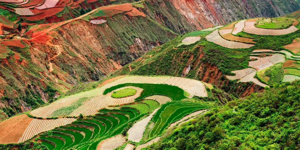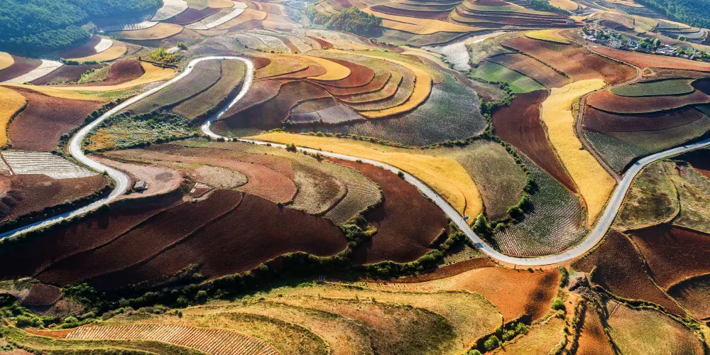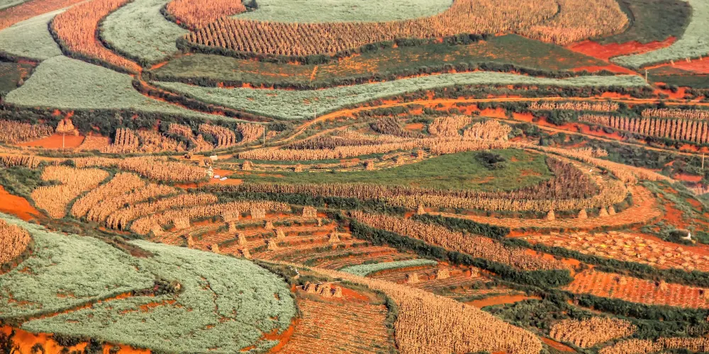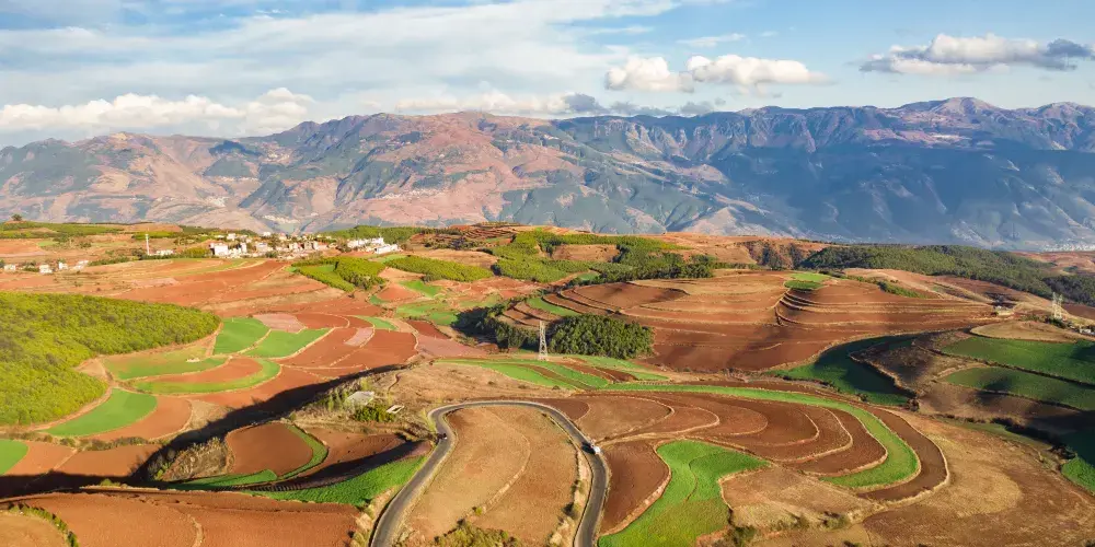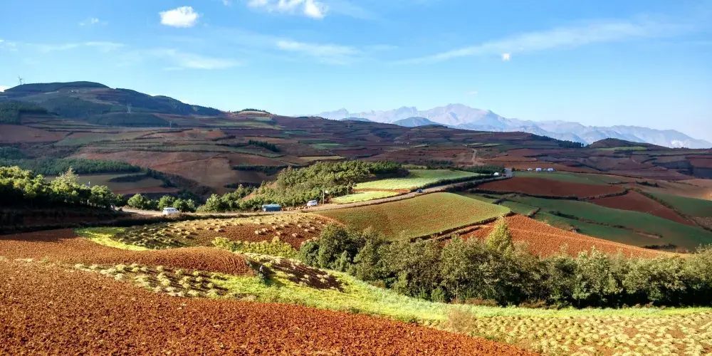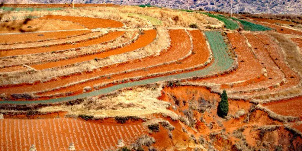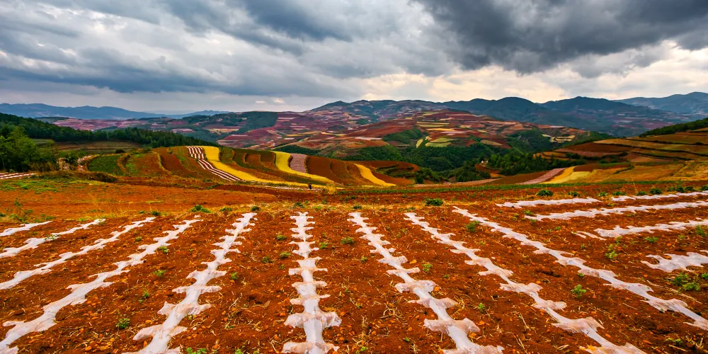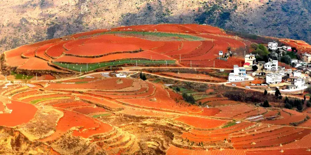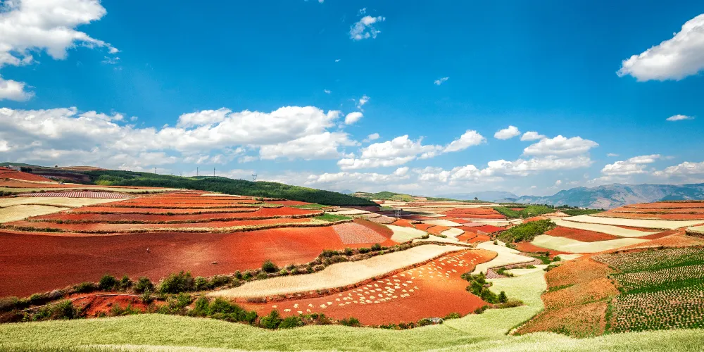 東川紅土地位於昆明市東北,因土壤裡含鐵、鋁成分較多,就形成了炫目的赤紅色彩。土地被田地和農作物分割成一個個色塊,遠遠看去,五彩斑斕,襯以藍天白雲,更為壯觀。紅土地景點較為分散,在花石頭村附近有一個明顯的三岔路口,是花石頭村至紅土地鎮、東川區和昆明三條公路的交匯點,三條線可以將紅土地的主要觀景點串聯起來,形成三條主要的觀景線路:西北線、東北線和南線。這幾年,紅土地逐漸成為了攝影愛好者的天堂。
