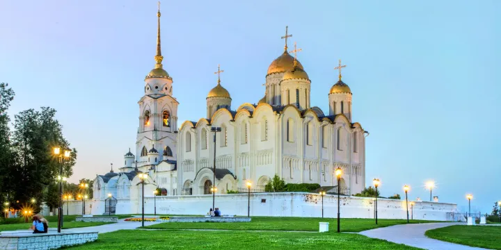 聖母升天大教堂坐落在市區克利亞濟馬河岩陡峭高地上,是俄羅斯現存最古老的教堂。以12世紀當地流行的“無色人工寶石建築結構”而聞名,是12世紀俄羅斯建築中最偉大的創造之一。在12到15世紀期間,沙皇都在此加冕。在共產主義禁教時期,唯有此教堂仍為民眾敞開大門,受到東正教的推崇。到了19世紀,由於原教堂不再使用,在原教堂右側蓋了白色大石教堂。教堂內還有文化中心、圖書館等。