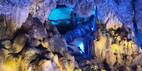 雙龍洞景區是一個形成已久的天然溶洞,洞口軒朗,兩側分懸的鐘乳石酷似龍頭,因此得名雙龍洞。外洞冬暖夏涼,遊客如炎炎夏日到此地便會有周身清涼的感覺。要由外洞進入內洞唯有平臥小舟,仰面擦崖逆水而入,有一種探險的刺激感和新鮮感。
