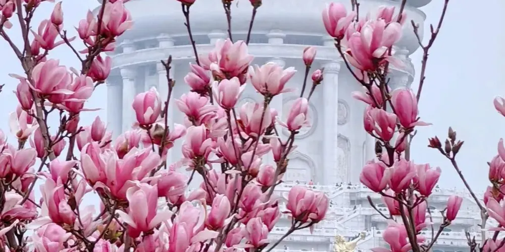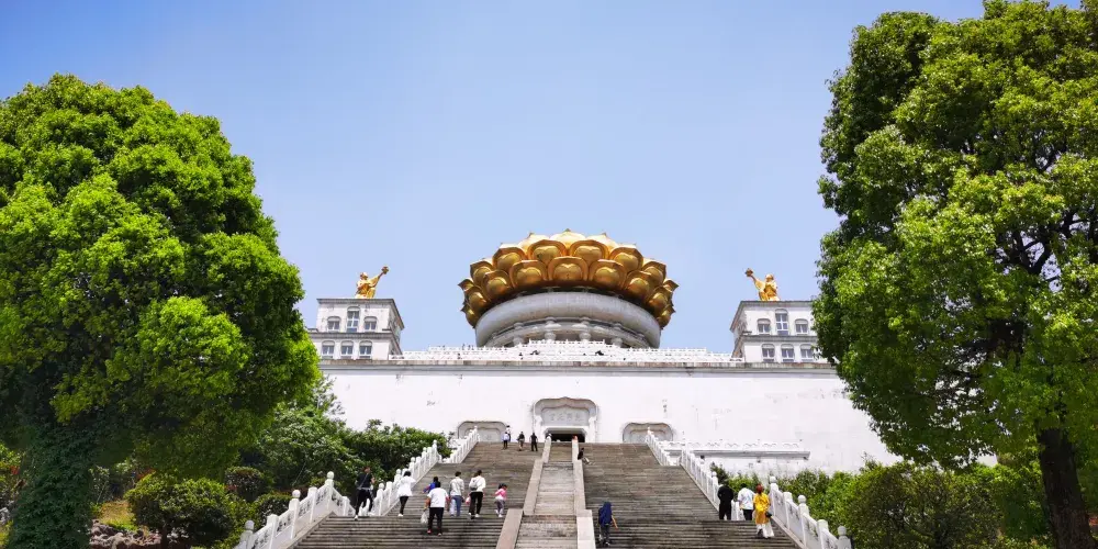 其中,粉牆黛瓦的江南民居風樓閣群,與紅牆琉璃瓦組成的寺院群相得益彰,一步一景,美輪美奐,彰顯了二十一世紀佛教寺院的建築典範。