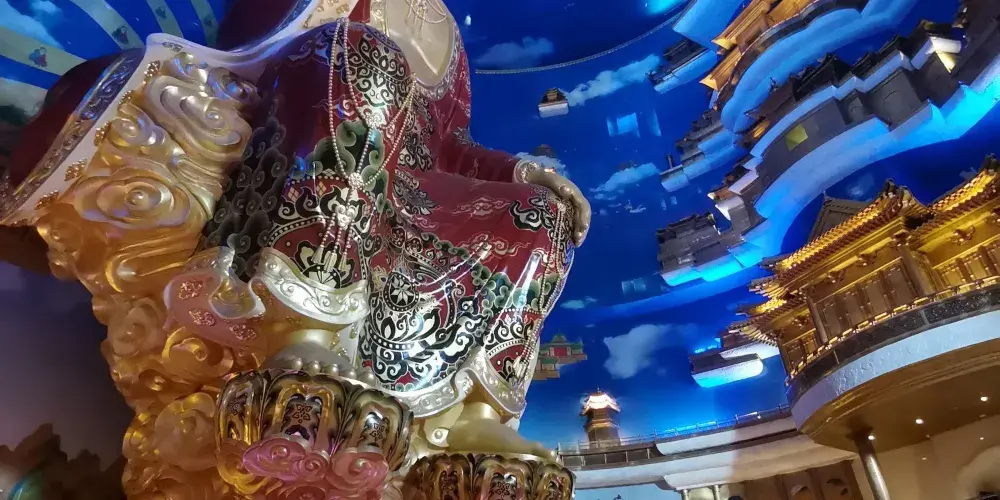 兜率天內院供奉著室內坐佛——33米高的說法天冠彌勒像,令人嘆為觀止。天宮頂部的紫金蓮花直徑56.7米。