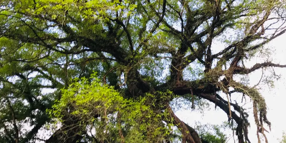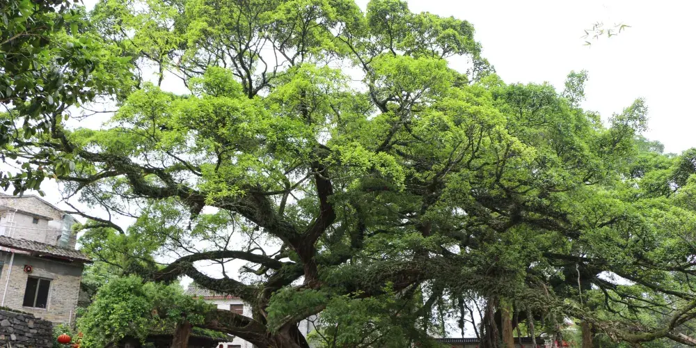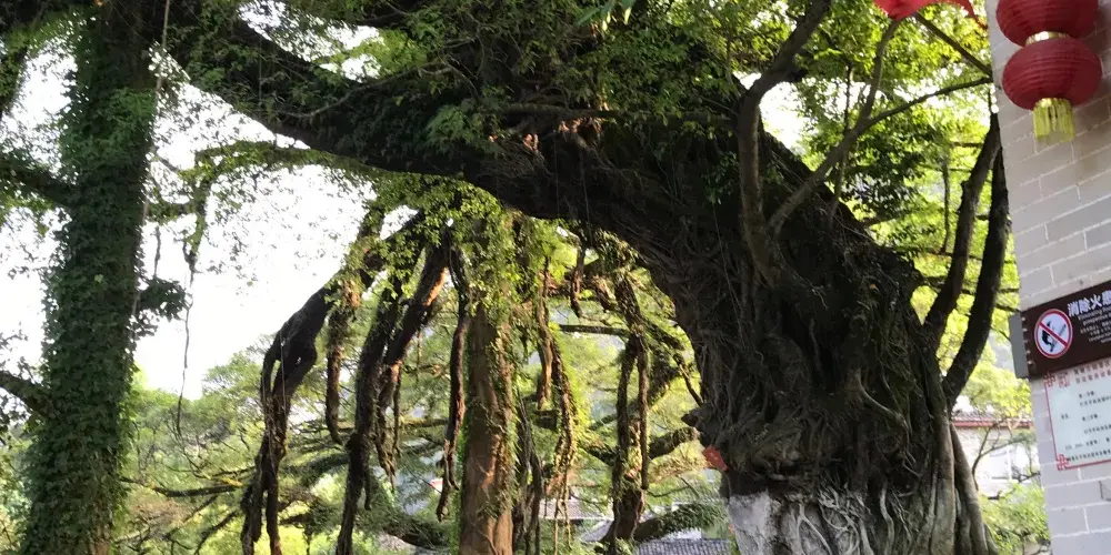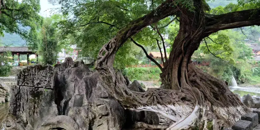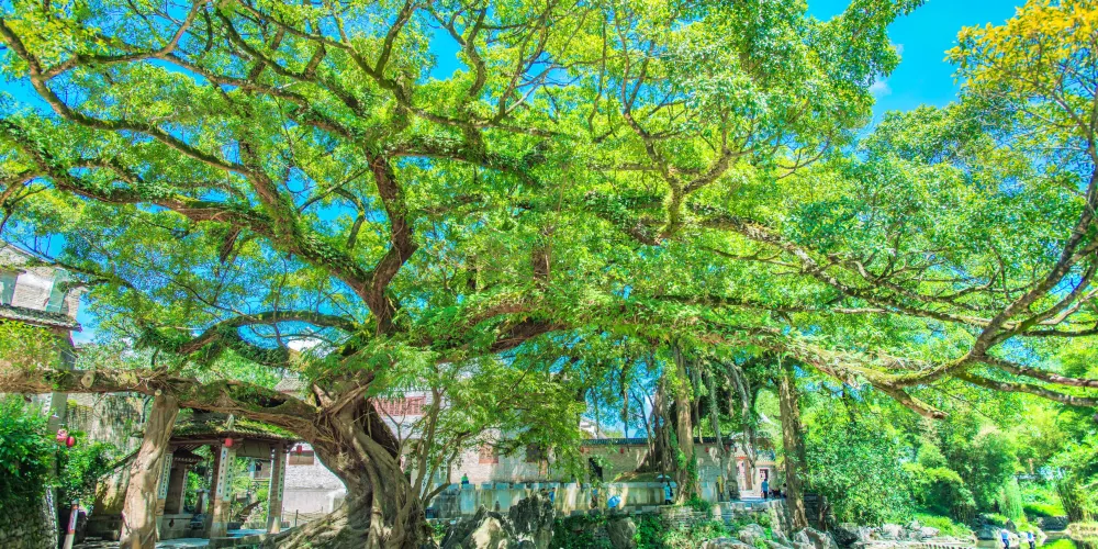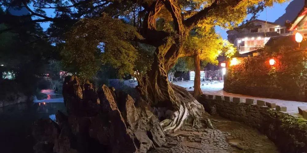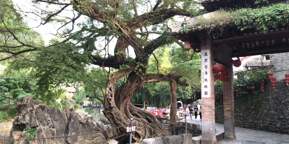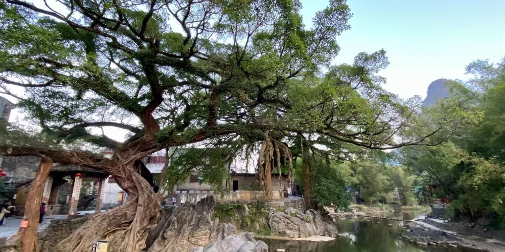 這顆有名的龍爪榕位於廣西賀州市昭平縣黃姚古鎮內,因其氣根形似龍爪而得名,至今已有500多年樹齡,從正門進入沿右岔路尋去即可看見。古樹是在石頭中生長,與巖石緊緊相擁,根鬚無法充分伸展,故又名“石上榕”。
