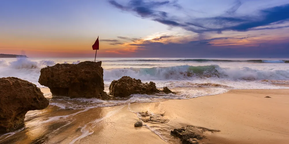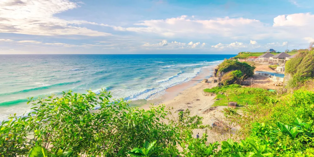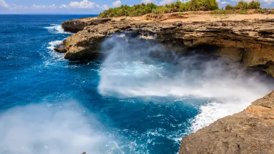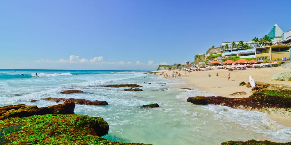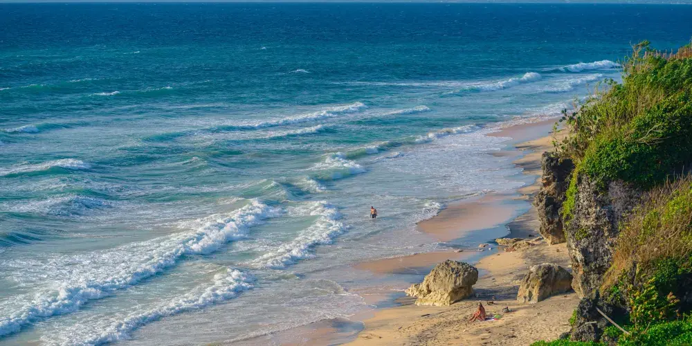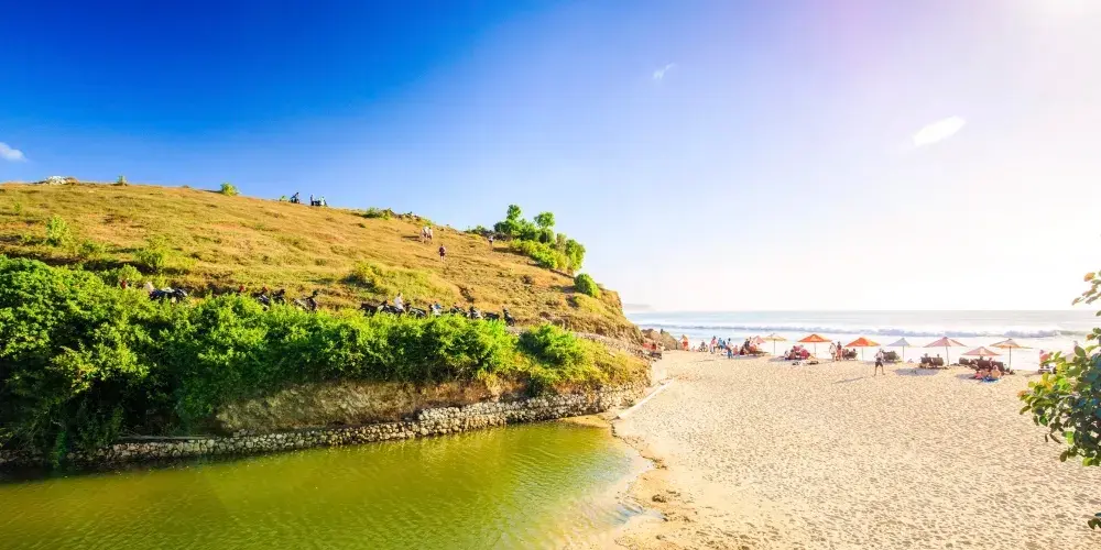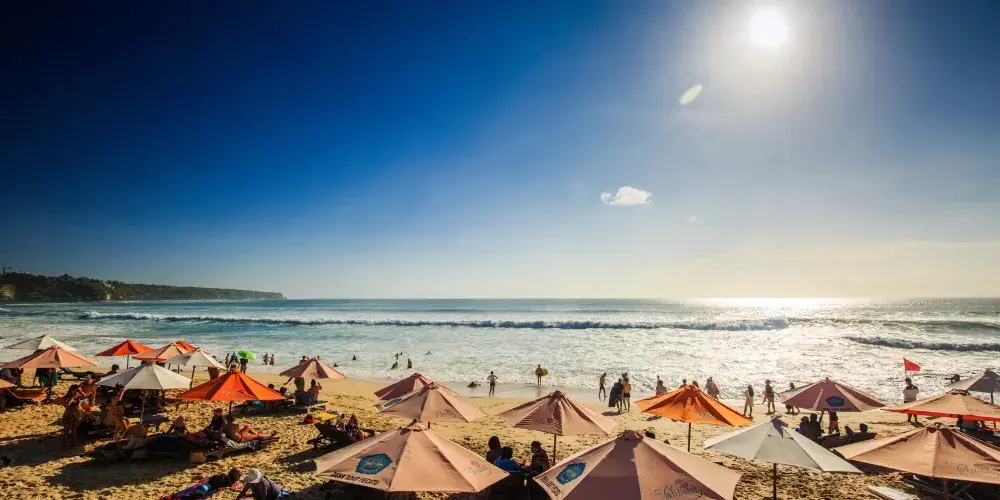 位於藍夢島,海灘非常美麗。可愛的弧形白沙灘邊是清澈碧藍的海水,還可以遠眺巴厘島上的阿貢火山。