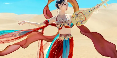 該雕像是根據敦煌壁畫中的其中一幅——中唐112窟中的《觀無量壽經變》內的“反彈琵琶”所制,該壁畫同飛天並稱敦煌樂舞壁畫中的兩大代表作,舉世聞名,是敦煌藝術中最優美的舞姿。《西方淨土變》中寫,伎樂天伴隨著仙樂翩翩起舞,舉足旋身,使出了“反彈琵琶”絕技時的霎那間動勢。她神態悠閑雍容、落落大方,手持琵琶、半裸著上身翩翩翻飛,天衣裙裾如遊龍驚鳳,搖曳生姿,項飾臂釧則在飛動中小叮噹作響,別饒清韻。