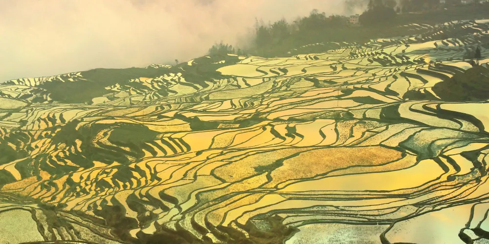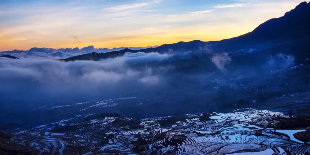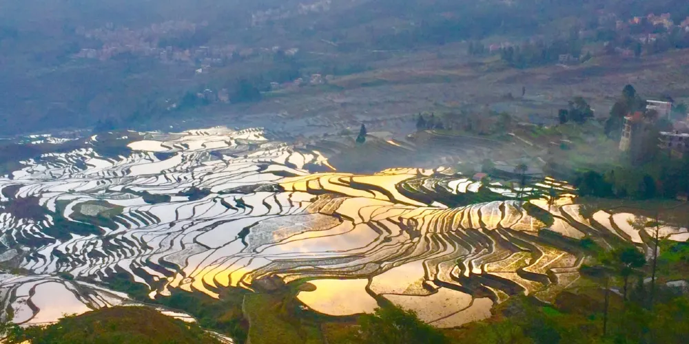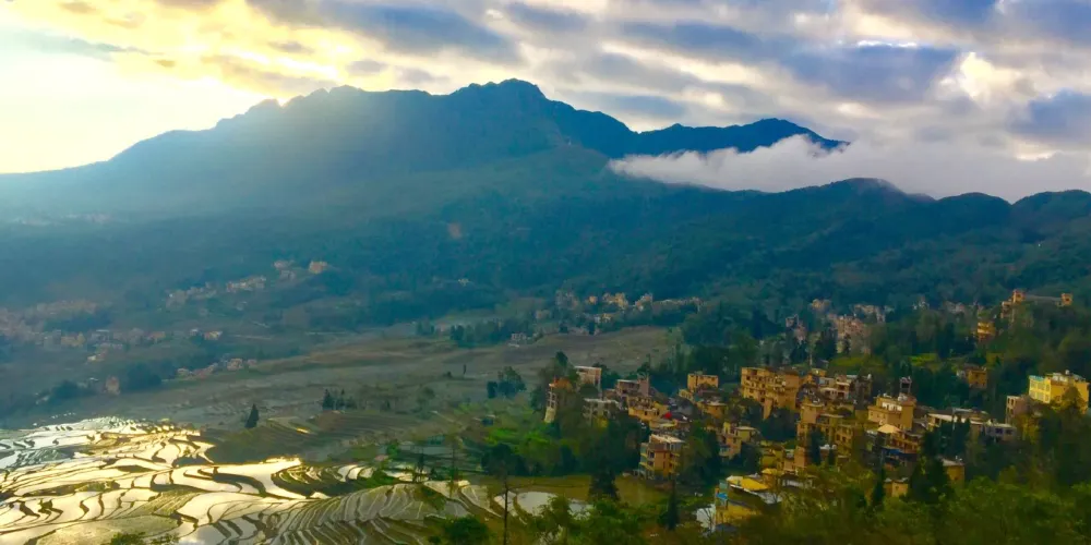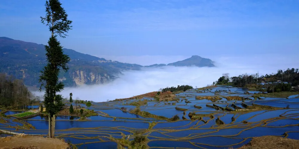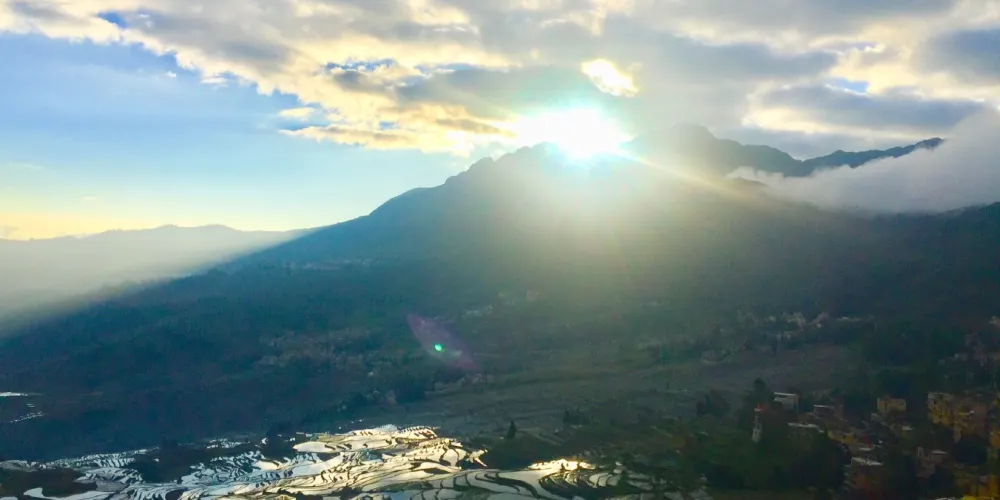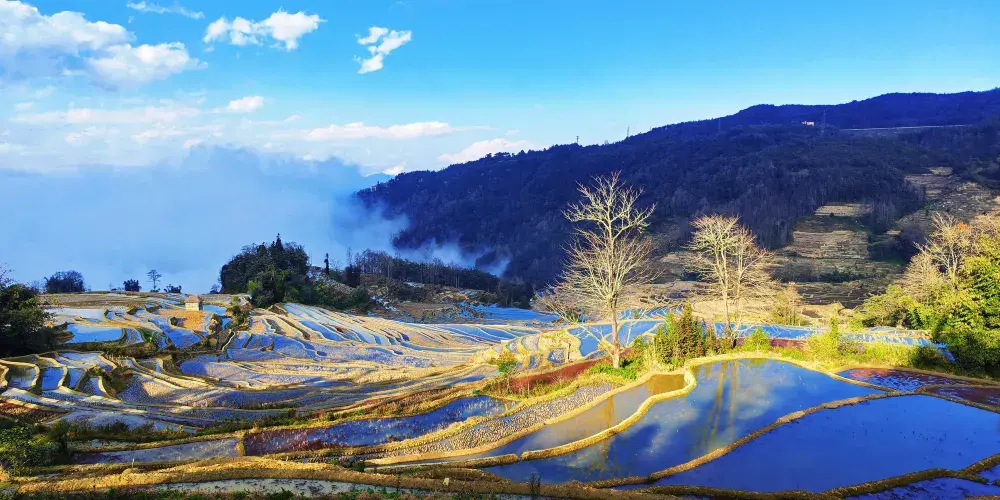 多依樹景區包括多依樹、愛春、大瓦遮等連片上萬畝梯田,像版畫一樣連綿壯觀。尤其是日出的時候,朝陽的光輝在梯田水面上跳躍,變幻出多樣的色彩。