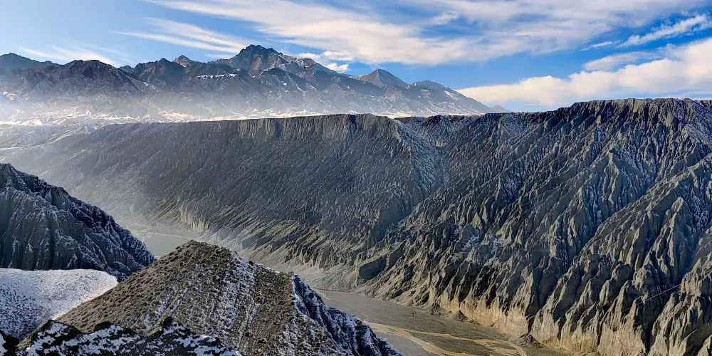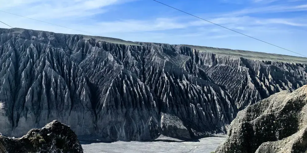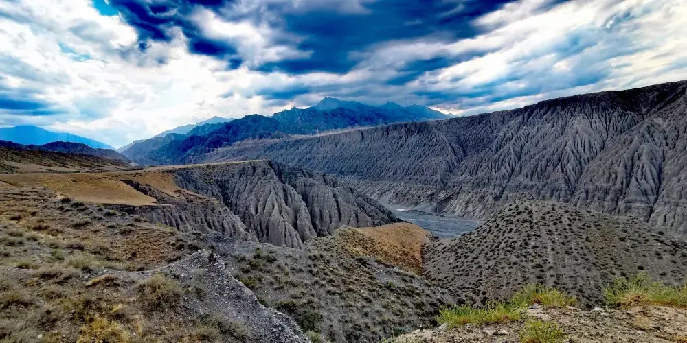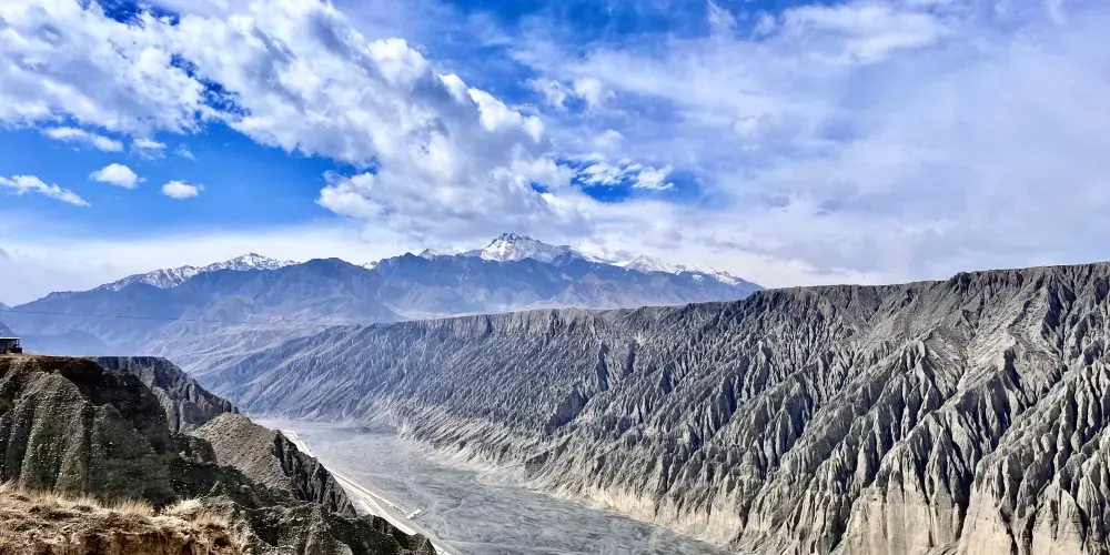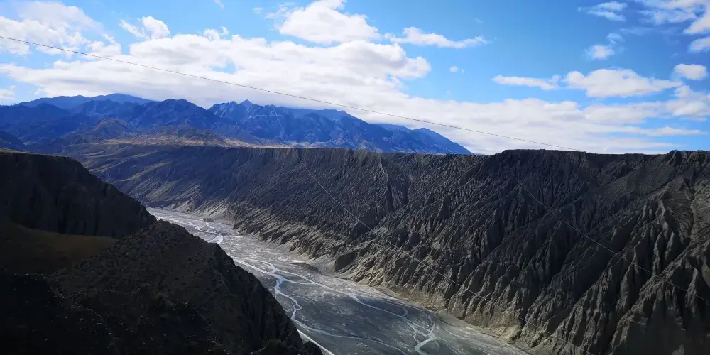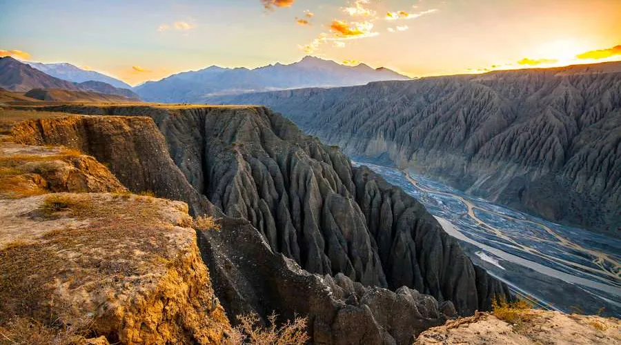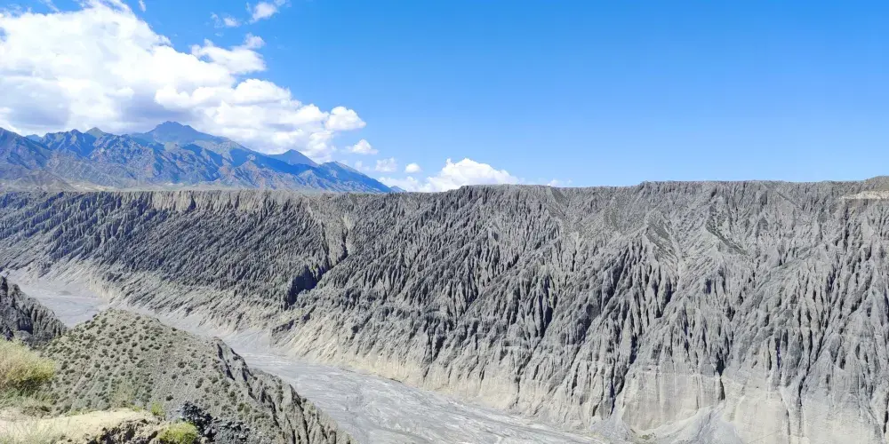 天山雪水同雨水流經呢度嘅土壤形成沖積溝壑,喺谷壁雕鑿出呢啲奇特景觀。峽谷由山腳開始,喺草原上形成層次分明嘅土壤層。但顏色主要仲係以灰色、黑色為主。峽谷嘅雪水量好大,但係經過呢啲土壤嘅時候,攜帶住泥沙令水變得非常混濁。