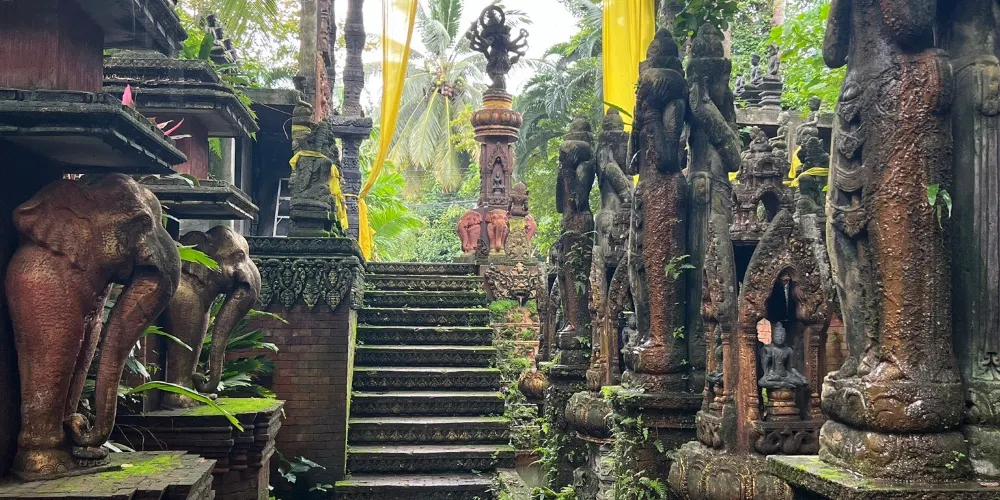 秘密佛園又名Magic Buda Garden,它的創始人是當地的一位果農,名叫Nim Thongsuk,他在1976年開始建立這個花園。他和他的團隊創造了很多栩栩如生的雕像,有動物、神明和各種人類的姿勢。每個雕像基本都有一個故事,大多數泰國人都會知道這些藝術品背後喚起的含義和神話。