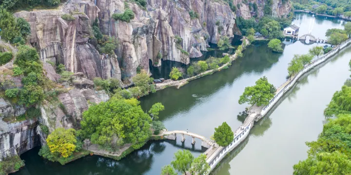 東湖面積不大卻煙波浩渺,給人一種小巧而有靈氣的感覺,因此東湖被人們比作“山水盆景”。此外,這裡也是82版《西遊記》中女兒國的取景地。東湖曾是一個採石場,兩岸是當年採石留下的陡峭山崖,這些開鑿的痕跡被山泉沖刷出一道道斑斕的色彩,煞是好看。還有一些窄窄的石洞,有的僅能容一艘船經過,很奇妙,因此乘烏篷船遊東湖也是許多人來此的理由。
