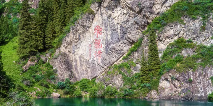 飛龍潭位於天池東北,距天池約500米,是天池水下瀉形成的潭,習慣稱東小天池。飛龍潭方圓百米,地處深澗,自然地形極為奇絕。神話傳説中是小飛龍的巢穴,故名“飛龍潭”。這裏潭水澄碧,松柏密匝,斷崖陡立,飛瀑奔流,煙雲飄繞,自成一處幽靜神祕,動靜相宜,意境不凡的特殊景觀。飛龍潭一潭掛兩瀑。上接飛珠瀉玉,瀑聲如雷,落差數十米的“飛龍吐哺”瀑布,下瀉“百丈崖”,形成飛流直下,含煙蓄翠,七彩飛虹的“懸泉瑤虹”瀑布。