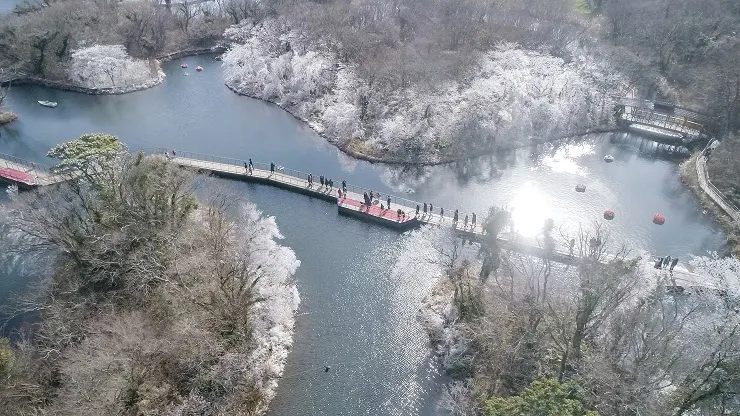 湖邊站是過去用於養馬的草地,可欣賞利用當初原來地形形成的碧藍湖水以及設有風車和發現王國的具有異國情調的車站。站在歷史的瞭望台上可以欣賞車站全景,2013年新開放的發現王國,沙子和探險船融為一體,是一處備受孩子們和喜愛照相留影的情侶們歡迎的空間。