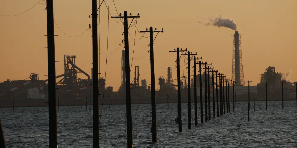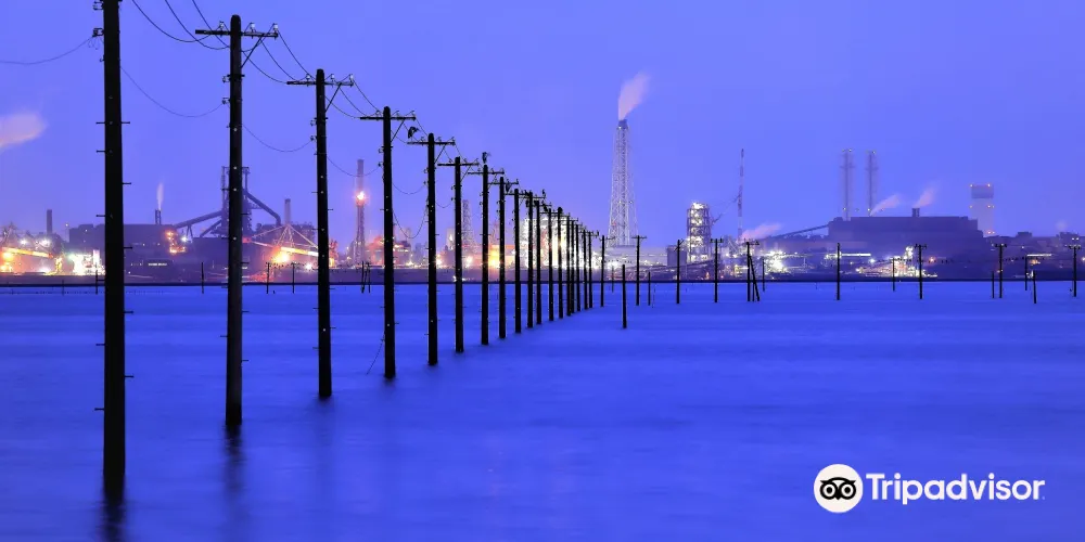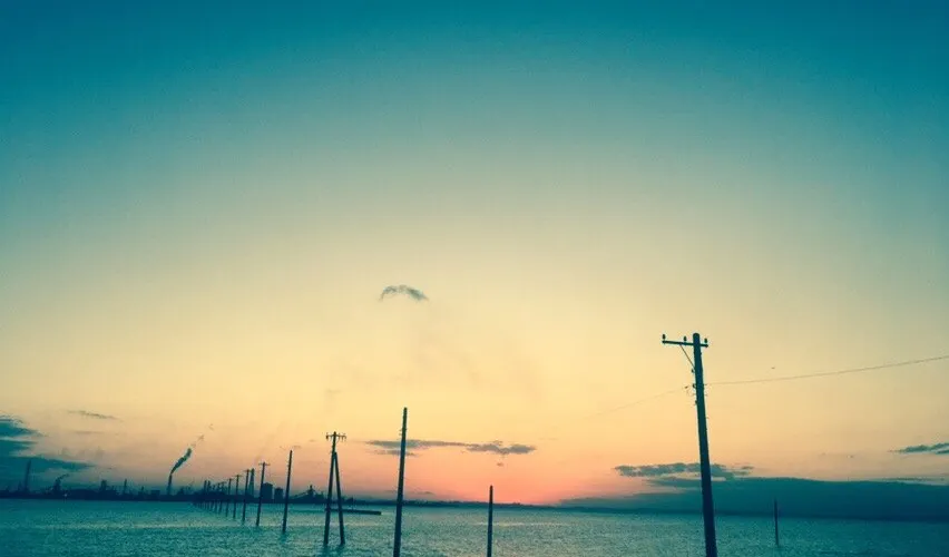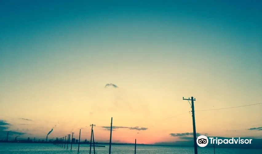 一根根電線桿矗立在海上,十分壯觀。這裏海水清澈蔚藍,日落之時海天相接,是一道靚麗的風景線。