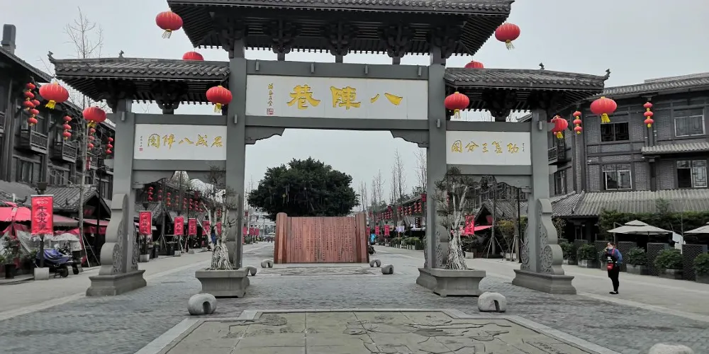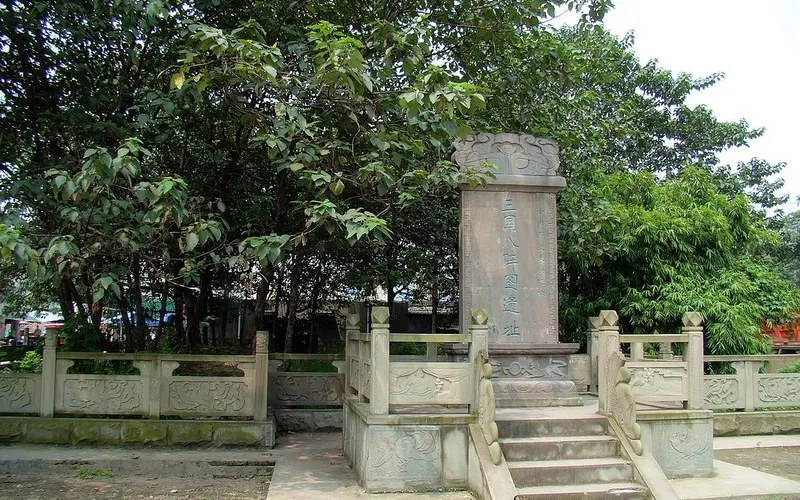 八陣圖遺迹位於彌牟鎮西南,精緻石欄圍了數百平米空地,便看見全國僅存的八陣圖遺址的6個土壘全部整齊列在不到100平方米的範圍之內,每個土壘高不到兩米,大小相近,高矮相當,成圓錐狀,均散落在竹林中。其中的三個土壘基座完好,另外三個則已被破壞成半壘狀。新近整修的用天然石材的圍欄石砫上,手法精湛地雕琢出一幅幅體現三國時代的畫卷。在土堆正面重豎了刻有清代李調元《八陣圖歌》的石碑。每個土堆周圍五米內都被納入了保護範圍,其間的建築物拆除的痕迹宛然猶存。駐足遐思,不禁遙想諸葛亮當年演習布陣的場面。