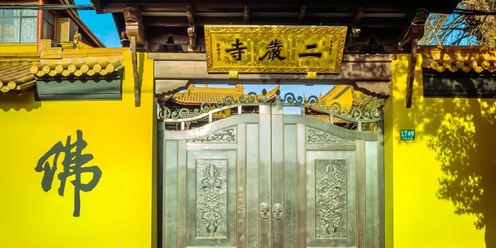 二嚴寺又名“佛閣”,始建於元代,佔地7000平方米,至今已有800餘年歷史。寺內原有一座由百年樟木雕刻而成的千手千眼觀音立像,可惜在“文革”中被毀。古寺於1993年因市政建設遷至現址,並與江海鎮張翁廟合并。寺廟由大雄寶殿、天王殿、玉佛樓等建築組成。寺內植有宋代古銀杏樹雌雄兩株,至今依然枝繁葉茂,遠近聞名。涅磐經十七曰“二種莊嚴”,一者智慧,二者福德,稱為“福智二嚴”,故取名“二嚴寺”。