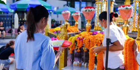 位於泰國曼谷的四面佛是泰國香火鼎盛的膜拜據點之一,深受明星的追捧。因為位於Central World等大型商場附近,因此這裡也成為了曼谷知名的觀光景點。在泰國及東南亞,四面佛被認為是很仁慈的神祗,所以在拜佛之前要戒葷吃素。