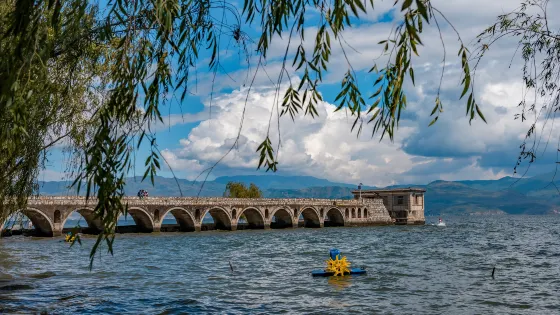 廊橋坐落於大理市灣橋鎮向陽溪村,是洱海邊備受歡迎的網紅打卡點。一開始是作為灣橋鎮的灌溉抽水渠,如今已轉變為遊客必訪的景觀地標。廊橋由九個獨特的半圓形橋洞構成,延伸至洱海,提供了豐富的觀景點。無論是站在橋上、橋下,或是透過橋洞,遊客都能欣賞洱海的迷人風景。廊橋不僅是環洱海騎行路線中的熱門景點,其獨特的橋洞設計為拍照提供了不錯的背景,尤其在強烈的日光下,光影反差效果令人驚嘆。交通方面,廊橋位置便利,從大理古城和喜洲古鎮均可輕鬆抵達。廊橋周圍環境清幽,是欣賞洱海美景的理想之地,適合遊客在此放鬆身心,捕捉美麗瞬間。