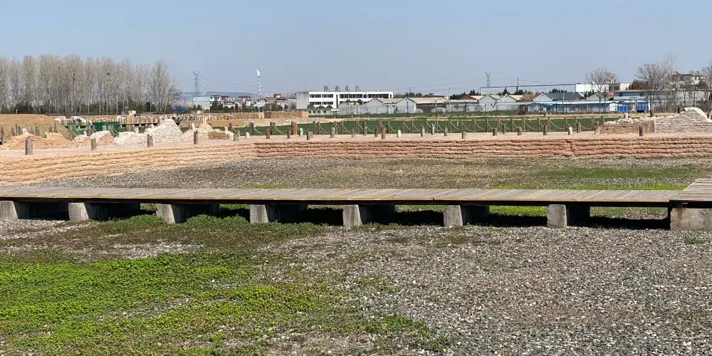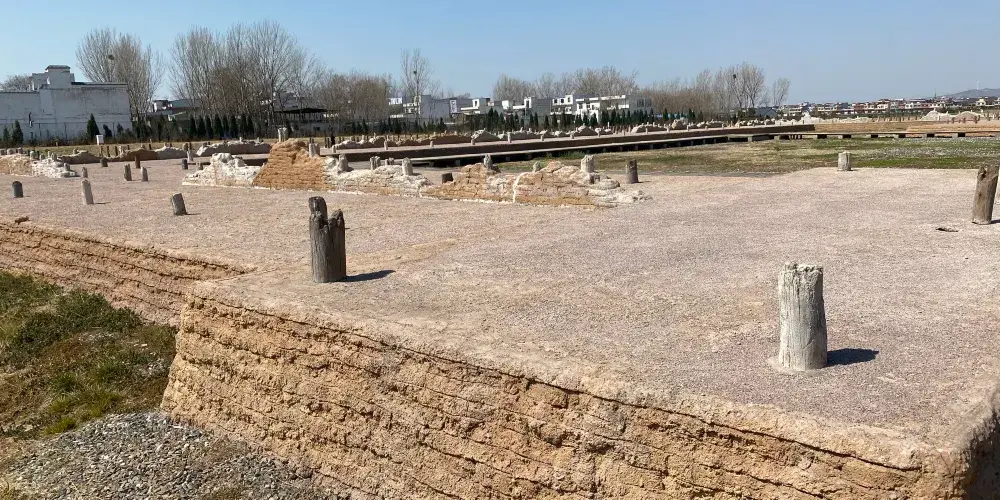 偃師商城遺址是中國商代早期都城遺址,北靠邙山,南臨洛水,是洛陽聞名的“五大都城遺址”之一。城池平面略呈長方形,南北長1700餘米,北部寬1215米,中部寬約1120米,南部寬740米。城牆夯築,南城牆已被洛河沖毀,現存西、北、東城牆,已發現城門7座,其中北面1座,東西面各3座。城內包括大城、小城、宮城三重城垣。城址內發現有城門、道路、宮殿、居址等遺跡,並出土大量石器、陶器、銅器、玉器等遺物。大城四周城牆均已發現,皆埋在今地表之下,殘高一般在1.5至3米左右。已發現城門多座,城外有護城河。小城位於大城內西南部,其西城牆、南城牆與大城西城牆、南城牆重合。宮城位於小城中央偏南。有學者認為這是湯都西亳,也有專家認為這裡是太甲所放處的桐宮。