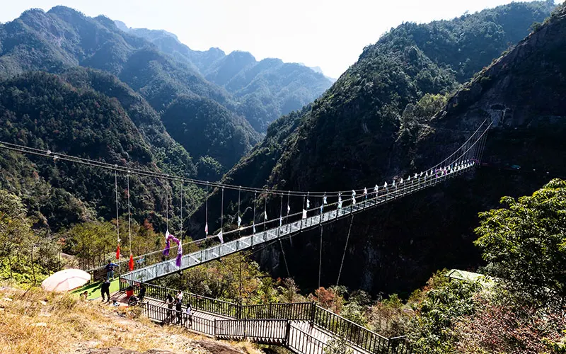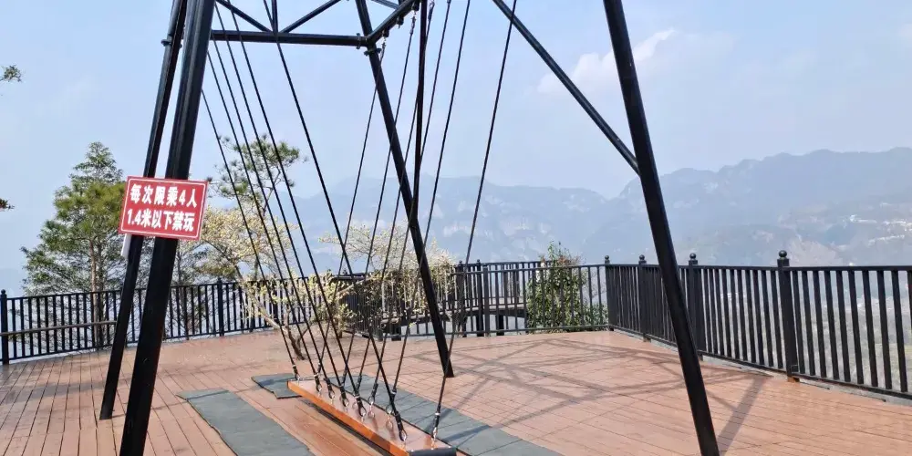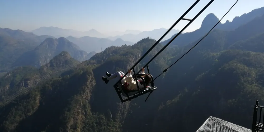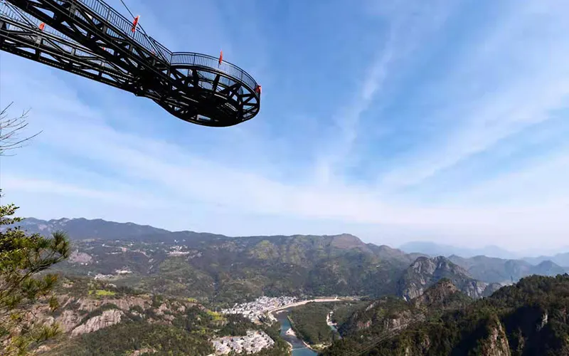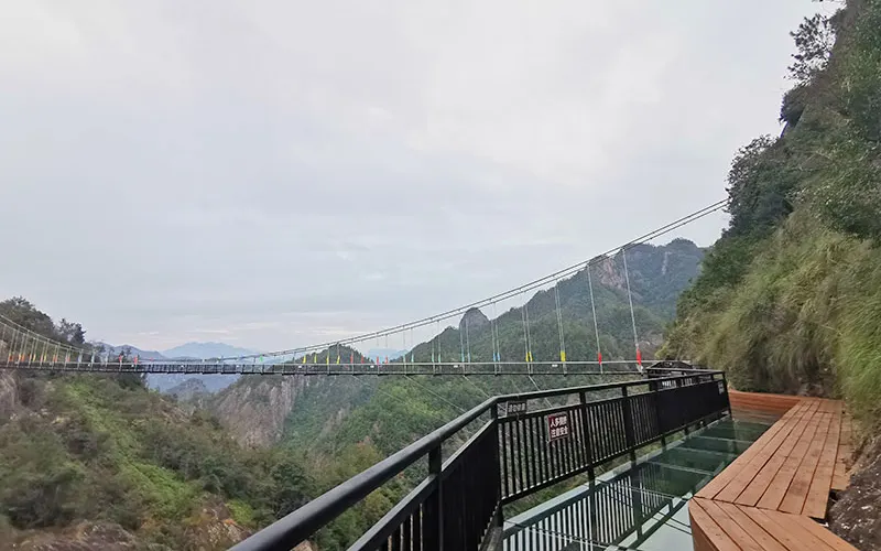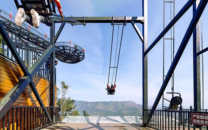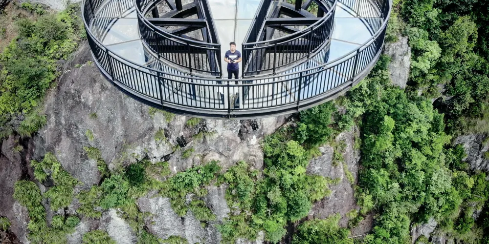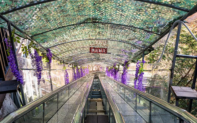 愛洛斯雲廊位於4A楠溪江核心區域永嘉書院景區內高峯,於2019年7月正式對外試營業,項目包含五大高空體驗:天空雲廊、懸崖鞦韆、玻璃天橋、雲上玻璃棧道、高山叢林玻璃滑道,整體長度1800米,各項目建築物高度落差高達400米,整體鋪設全透明三層夾膠鋼化透明玻璃,遊客可以站在透明的玻璃上走看着底下的山谷和遠處的風景,體驗楠溪江風景另一個角度的魅力。天空雲廊愛洛斯·天空雲廊位於永嘉書院觀景台之上,雲廊出峯總長度68米,建築總面積約300平方米,高落差達400米。整個雲廊由H型鋼桁架和全透明玻璃組建,平面佈置呈”A”字型,頂端為圓形迴廊觀景台,也是整個雲廊落差大的地方。置身天空雲廊之上,楠溪江美景盡收眼底,看四周,雲遮霧繞,山峯林立,蒼林翠滴,恍若仙境。懸崖鞦韆愛洛斯·懸崖鞦韆,共有三組,位於海拔350米的山體上,其中一組吊索長達10米,另外兩組吊索長為6米。坐在鞦韆之上,盪出去的高落差可達400米,讓人頓生騰空之感,彷彿插上了一雙翅膀,直上雲霄。當鞦韆回蕩在高點的適合,放眼遠望,“盪胸生曾雲,決眥入歸鳥。”之感撲面而來。玻璃天橋愛洛斯·玻璃天橋全長200米,寬2米,高落差約280米,整座天橋橫跨於兩座陡峯之間,宛如彩鏈,橋身使用全透明玻璃鋪成,且為保證遊客的安全,每塊玻璃均採用三層鋼化夾膠結構,具有高強度、抗彎曲、耐沖擊等特點。遊客走在橋面仿如在雲中漫步,抬眼望去,一條飛瀑懸掛於對面山壁之上,“飛流直下三千尺,疑是銀河落九天”之美景躍然入目。雲上玻璃棧道愛洛斯·雲上玻璃棧道建於落差近280米的懸崖之上,宛如一條巨龍盤恆在愛洛斯·玻璃天橋之畔。棧道使用全透明、高透光玻璃鋪成。行走在玻璃棧道上,一面是懸崖陡壁,一面是百丈深淵,讓您切身體會如臨深淵,如履薄冰之感。晴天時,藍天白雲與青山綠水的倒影鋪滿整個棧道;若是霧天,玻璃棧道若隱若現,其美景更是讓人驚讚不已。高山叢林玻璃滑道愛洛斯·高山叢林玻璃滑道全長280米,大落差300米。滑道主體呈S型透明玻璃管狀,採用了雙滑道設計,並在沿途有多個拐彎角,遊客利用重力慣性“一滑而下”。為了增加安全性,滑道兩側設有自動減速扶手,遊客可通過腳踩和手扶的方式自行減速,使遊客的滑行速度自由可控。“玻璃滑道順山下,一秒山上,一秒山下”。