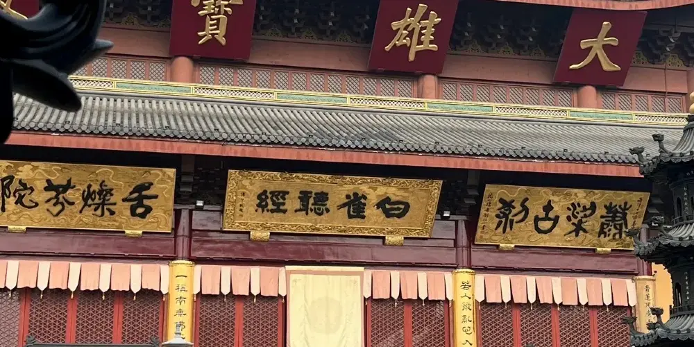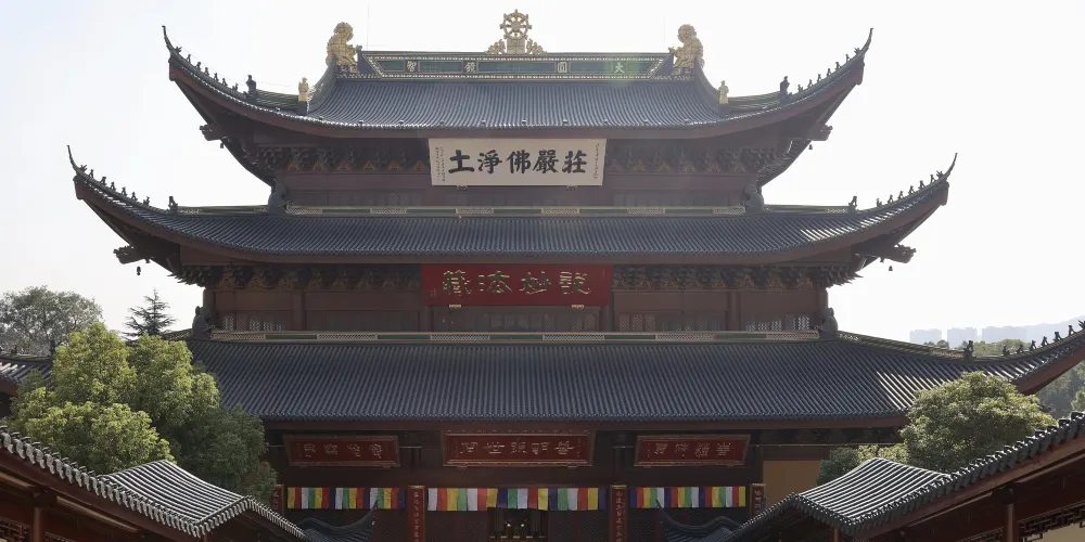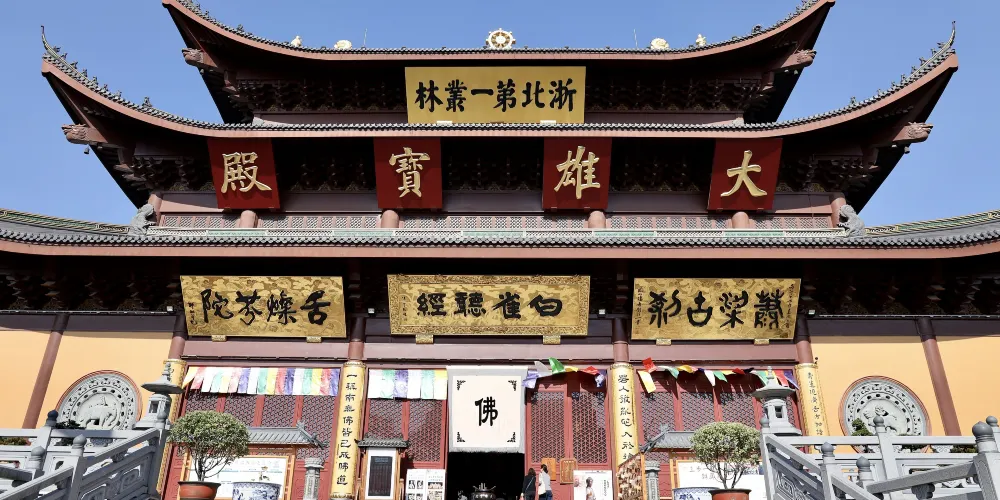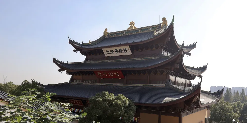 位於湖州太湖旅遊度假區南麓,原名石斗山,又名白雀寺,山因寺名,湖州四大名剎之一。是一座以觀音為主題的寺廟。這座殿宇從建築構造上看沒有什麼特別之處,但是它佔的這塊地卻非同一般,剛才講的這個傳奇故事就發生在這裏。殿堂中間的這座佛壇下面就是原來歸葬神尼的寶龕,一朵青蓮正是從這下面的青石板之間長出來的。佛壇上端坐的佛像就是觀音菩薩。這尊觀音菩薩與其他寺廟的不一樣,一身仕女裝飾,像是一位美貌俊麗的公主。其實她真是一個王侯的公主,人們把她當做觀音菩薩來供奉,是由於一則悲壯而動人的民間神話故事引起的。
