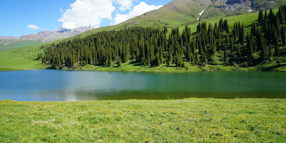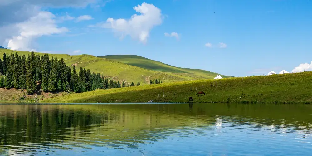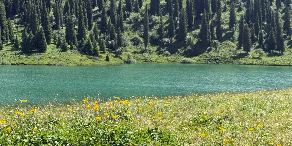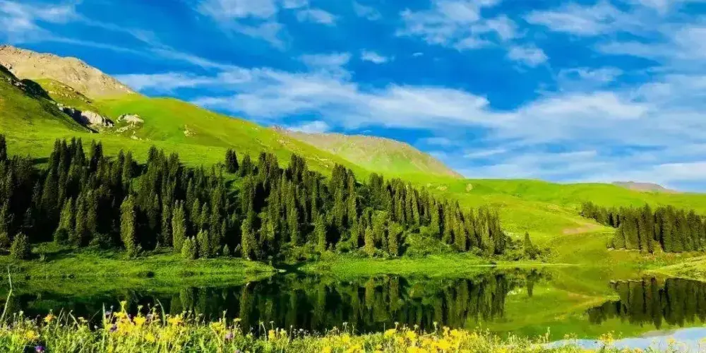 新疆仙女湖民俗文化旅遊景區位於伊犁哈薩克自治州尼勒克縣唐布拉草原的闊爾克山上,海拔兩千多米,宛如一顆璀璨的明珠鑲嵌在天山深處。湖水清澈見底,宛如鏡面,在陽光的照耀下波光粼粼,呈現出迷人的寶石綠色。三面雪山環繞,倒映在湖水中,形成了水天相接、雪山與湖泊交融的優美畫面,彷彿一幅天然的山水畫卷。景區內草原廣袤無垠,野花肆意綻放,紅的、黃的、紫的…… 爭奇鬥艷,宛如一片花的海洋。草原上還點綴著鬱鬱蔥蔥的雲杉林,它們高聳入雲,與草原、湖泊相互映襯,構成了一幅充滿生機與活力的自然景觀。遊客可以騎著當地牧民提供的馬匹,沿著湖邊緩緩前行,欣賞湖光山色的同時,也能感受到騎馬的樂趣。