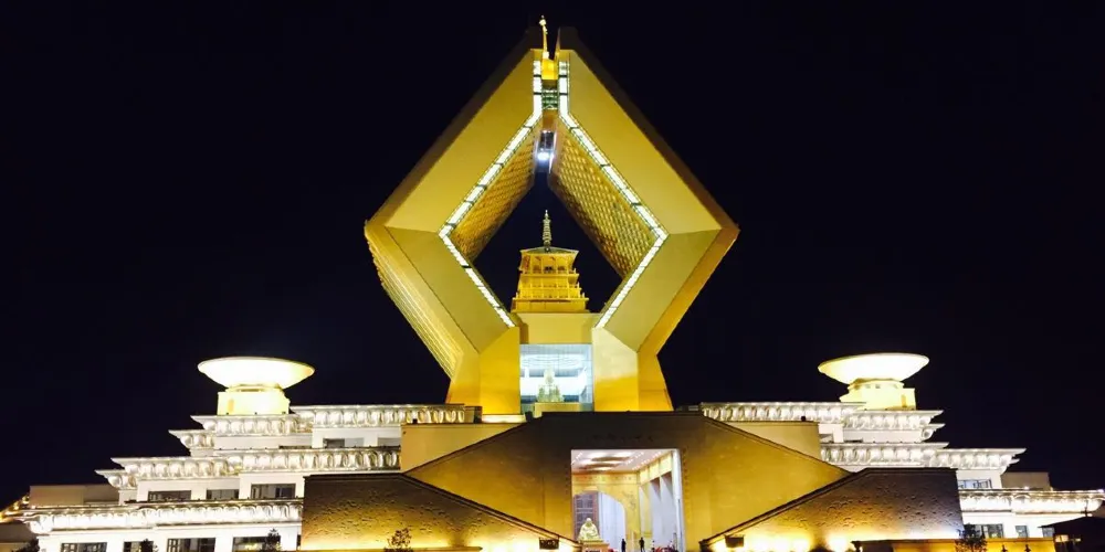 如果你是從文化景區西側的山門廣場進入景區,那麼呈現在你眼前是長約1公里的佛光大道,大道兩旁站立著十尊閃耀著金光的巨大菩薩雕像,大道東側的盡頭就是合十舍利塔,大道上有觀光車可以乘坐。佛祖指骨舍利,只在農曆每月的初一和十五、週末和重大節假日才對外開放。