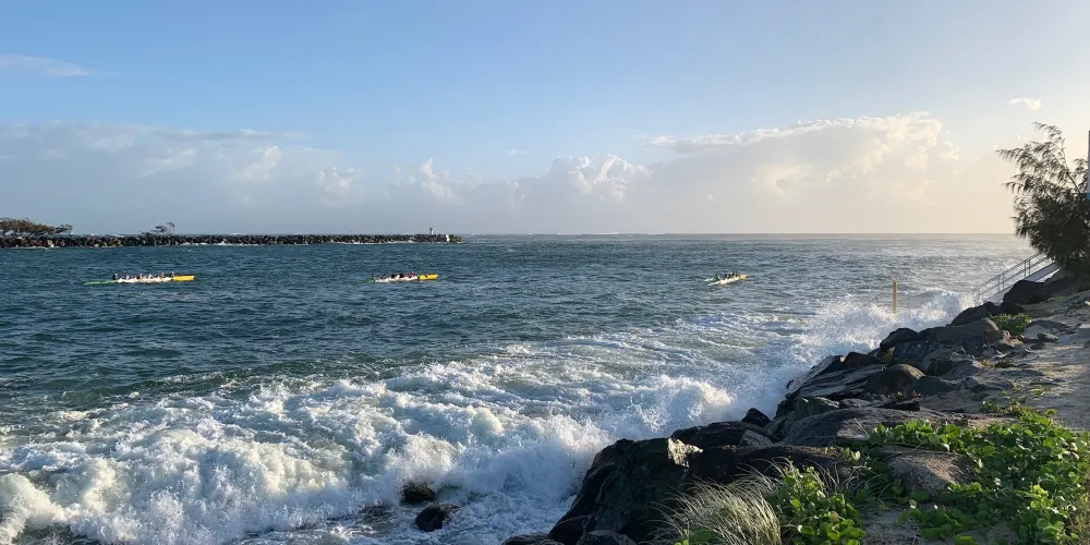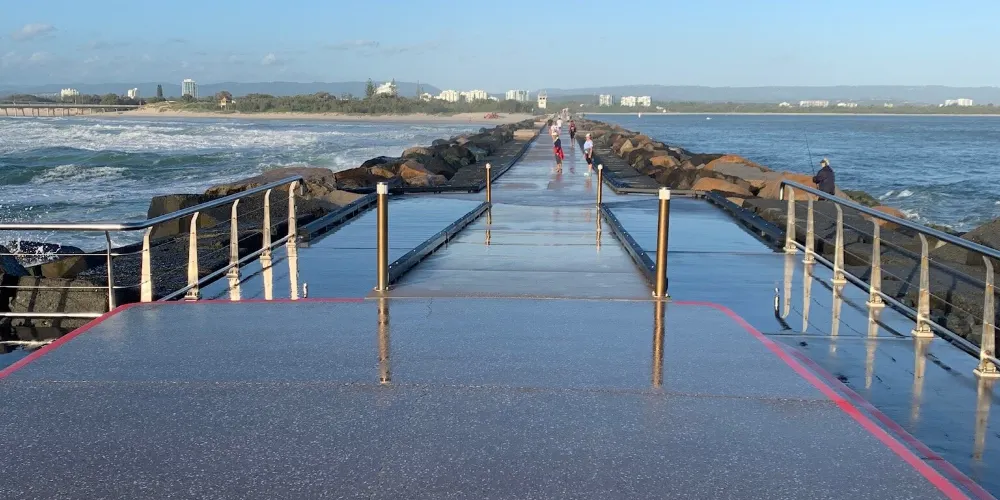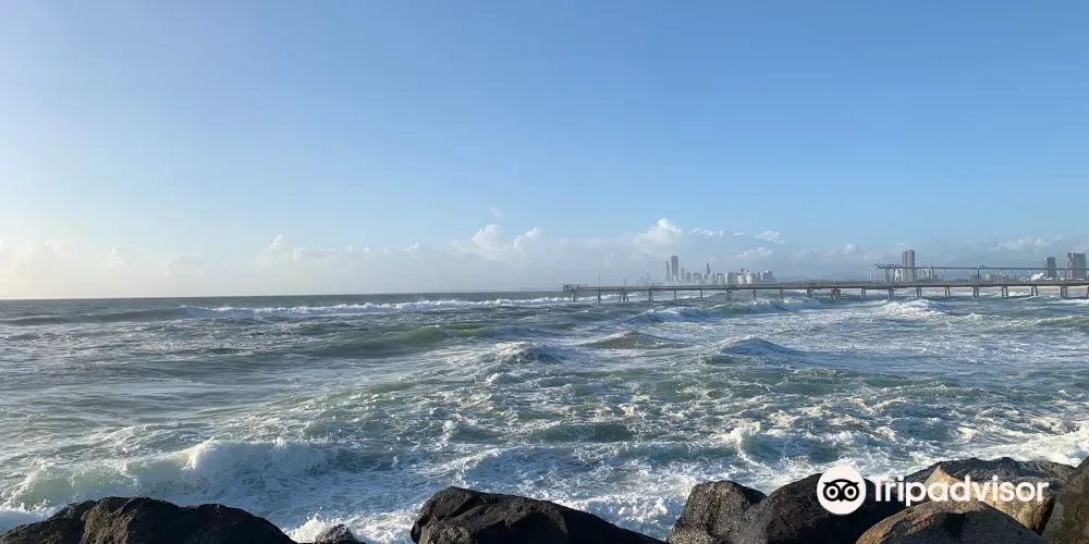澳洲最著名的海灘之一,吸引全球各地的衝浪愛好者前來。黃金海岸毗鄰太平洋,擁有75公里長的海灘,是一片廣闊的沙質海岸。這裡的海岸線筆直寬闊,岸邊水淺浪大,非常適合進行衝浪等各種水上運動。其中連綿不斷的海灘長達42公里。轉角懸崖處有一片礁石,層層浪花從礁石懸崖奔湧而來,浪高達2至3米。若遇海上風暴,浪濤轟鳴,掀起洶湧波瀾,其壯觀景象令人驚嘆。