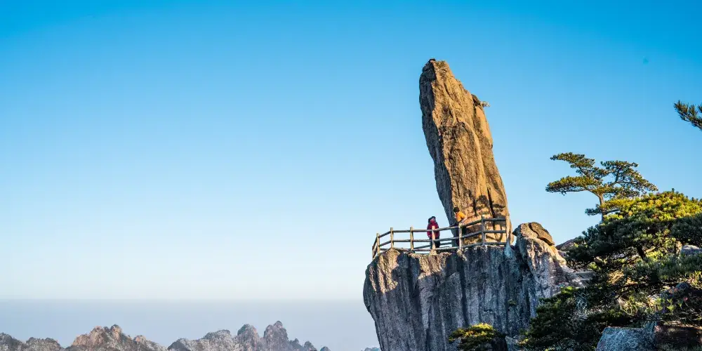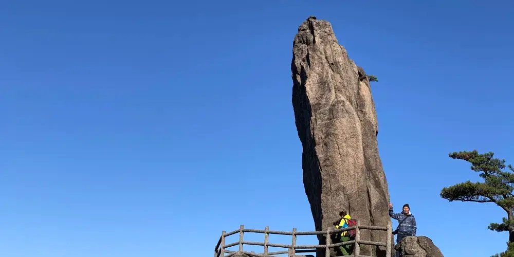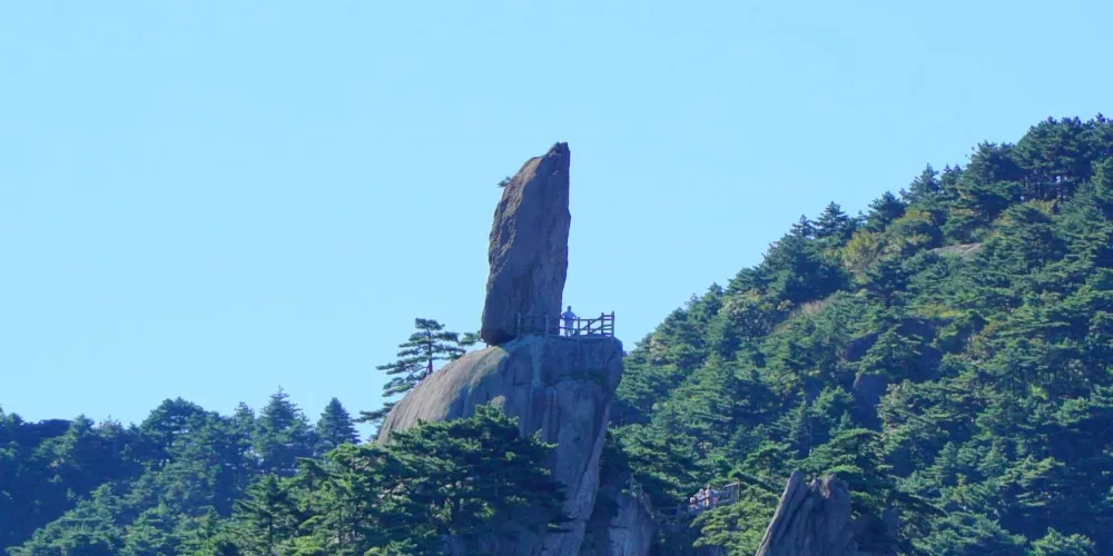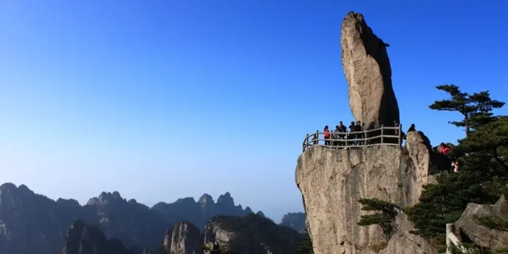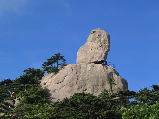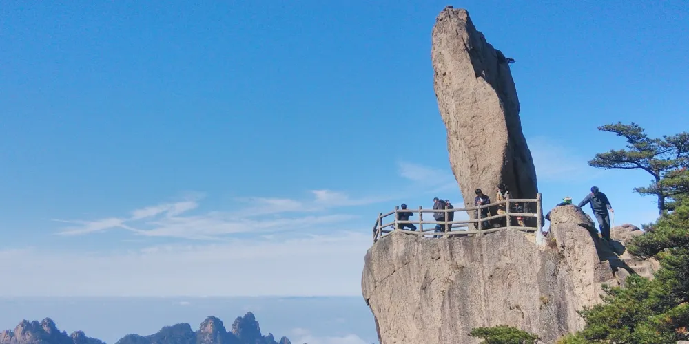 飛來石又稱飛來峰、仙桃峰,位於光明頂和排雲亭的中間,是黃山的地標之一。飛來石高12米,重600噸,底部與山石的接觸面積很小,看起來搖搖欲墜卻始終屹立不倒,非常神奇。 1987年央視版《紅樓夢》曾在此取景。飛來石形似從天外飛來落在崖上的巨石,相傳宋代有個叫單福的石匠,一生想給家鄉人民修座橋,但工程浩大,十分辛苦,八仙中的鐵拐李為之感動,使用法力將黃山上的石頭搬到了建築工地,後多餘下一塊巨石,鐵拐山到風景從此,這飛來石在這裡落地生根。