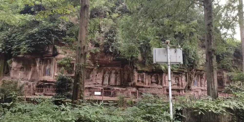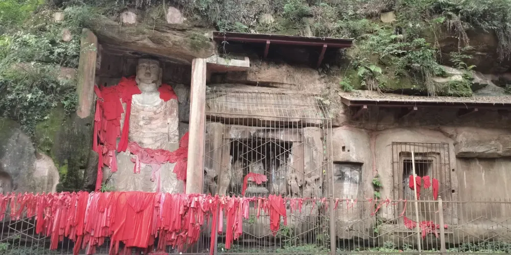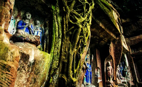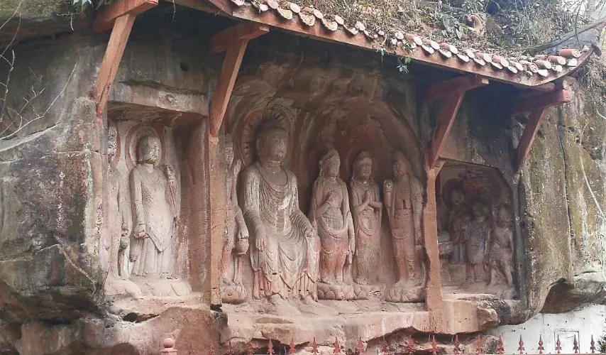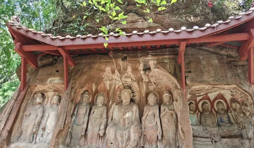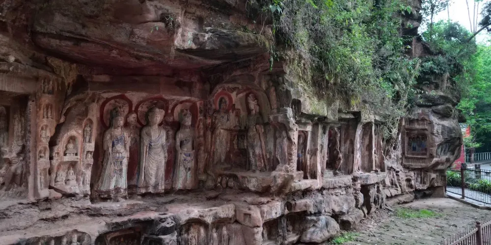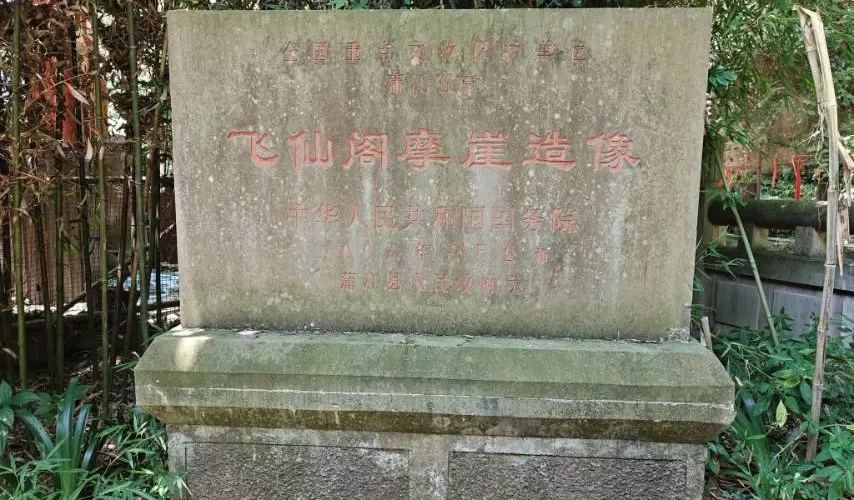 飛仙閣是蒲江沿蒲江河和臨溪河岸14處兩漢至唐宋摩崖石刻造像羣中規模較大、保存完整的一處。武則天永昌六年(公元689年)造飛仙閣92龕777尊摩崖佛雕,不但是四川省至今仍保存有盛唐時期佛教摩崖造像的地方之一,而且存有不少道教、西域文化的痕跡。值得大書特書的是第60號龕,共有造像10尊,總高1.28米,寬1.85米。毗盧佛戴寶冠,身着偏衫,袒露右肩,右臂戴寶釧。右邊供養人為婦女,頭綰雙髻,身着小袖衫,長裙曳地,腳穿大頭鞋。