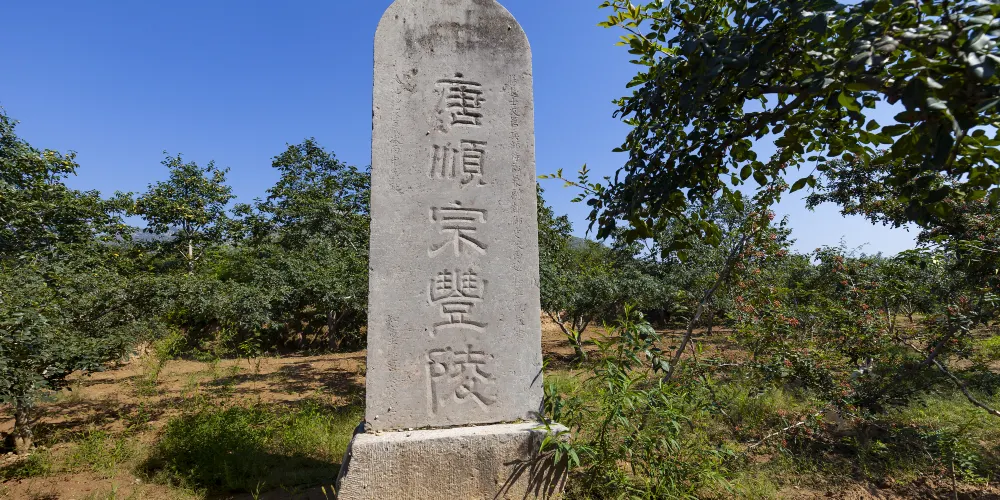 唐豐陵是唐朝唐順宗李誦與莊憲皇后的合葬陵,東北距唐睿宗之橋陵26公里。順宗李誦是唐代在位很短的皇帝之一,陵園規模較小。由於歷史的變遷和自然因素的破壞,豐陵陵園內的建築遺跡已所存無幾。陵園內城四門外原各置石獅1對;朱雀門外原置石人10對、石馬5對、鴕鳥1對、翼馬1對、華表1對;玄武門外原置石馬3對。今已損毀殆盡。惟朱雀門外現存殘華表1件,八稜柱狀,仰覆蓮寶珠頂,通高3.71米,稜面寬0.38米不等。陵園內另有清代巡撫畢沅所立“唐順宗豐陵”石碑1通。