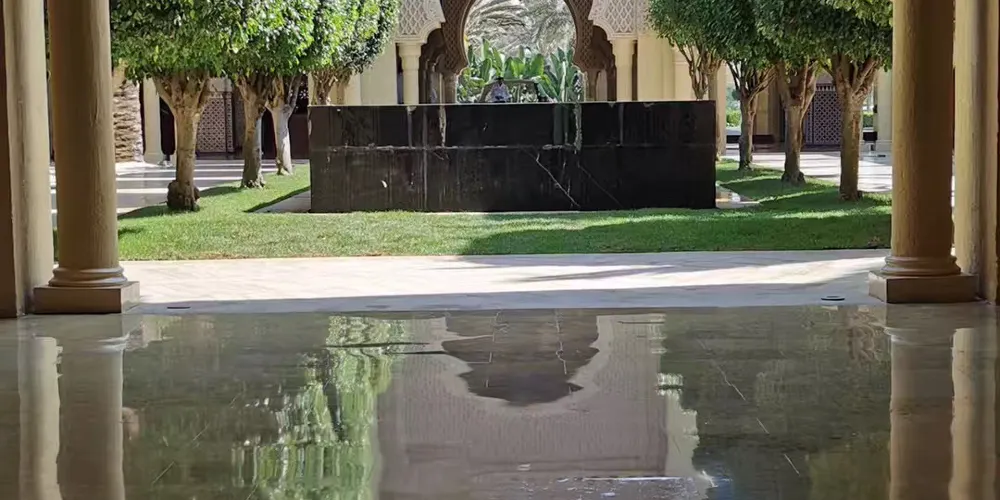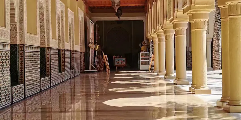 阿塔里納學院,位於摩洛哥非斯,是一座歷史悠久的古蘭經學院。這座14世紀由馬林王朝蘇丹阿布賽義德建造的古蘭經學院,以幾何美學詮釋伊斯蘭建築精髓。庭院中央的雪花石膏噴泉倒映著雕花雪松木穹頂,牆面覆蓋著薄荷綠與鈷藍色澤的澤利吉馬賽克,藤蔓紋石膏浮雕在晨光中泛起珍珠光澤。