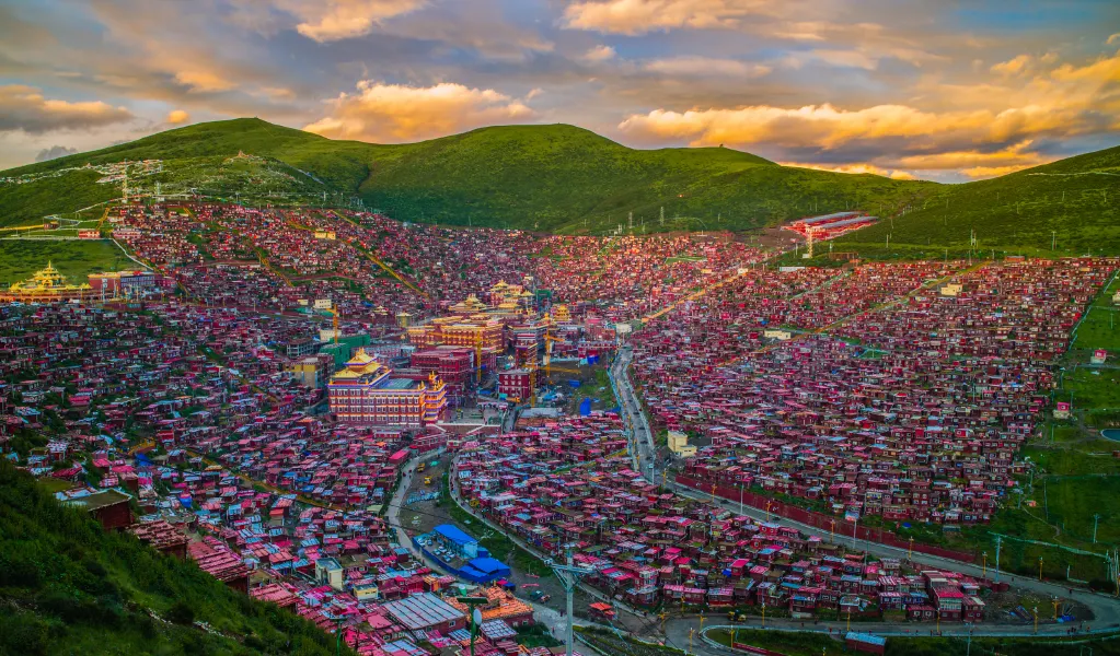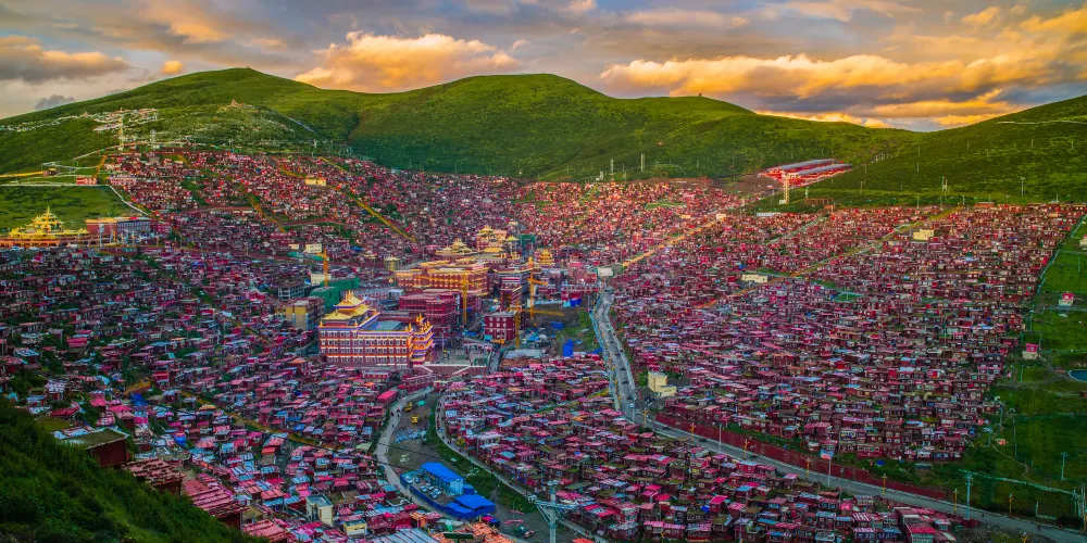 該寺廟建築羣,坐落在色達縣境縣城東南方約20公里處,被重重羣山環抱。這裏以大經堂為核心,數以千計的小木屋密密麻麻如同蟻巢般佈滿山坡,為數眾多的絳紅色小木屋,延綿起伏,蔚為壯觀。