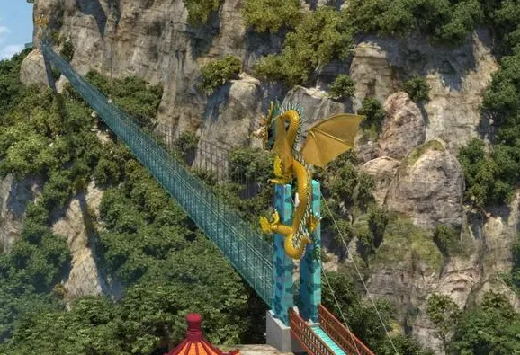 飛龍玻璃橋上還增設了特效裝置,是一座帶有特效的玻璃橋,從遠處看,兩條巨龍盤踞在玻璃橋兩端,橋下萬株楠木,宛如一幅“飛龍天橋看楠海”的絕妙畫卷。