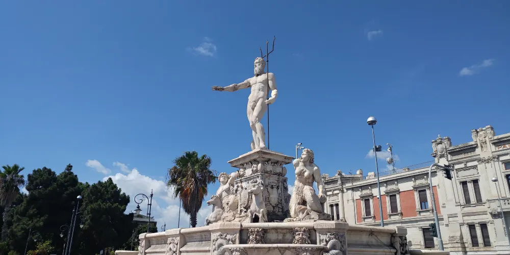 海王雕像噴泉在大教堂廣場上,與教堂和鐘樓的一側。噴泉是面海而立,噴泉底座上站立這一尊海王雕像,他一手持着三叉戟,一手伸向前方,寓意賜福於墨西拿。由於墨西拿遊客很少,可以靜靜地在廣場上靜靜欣賞這座美麗的噴泉。