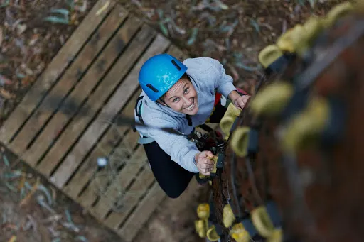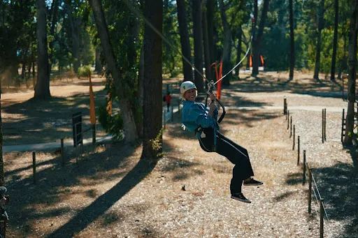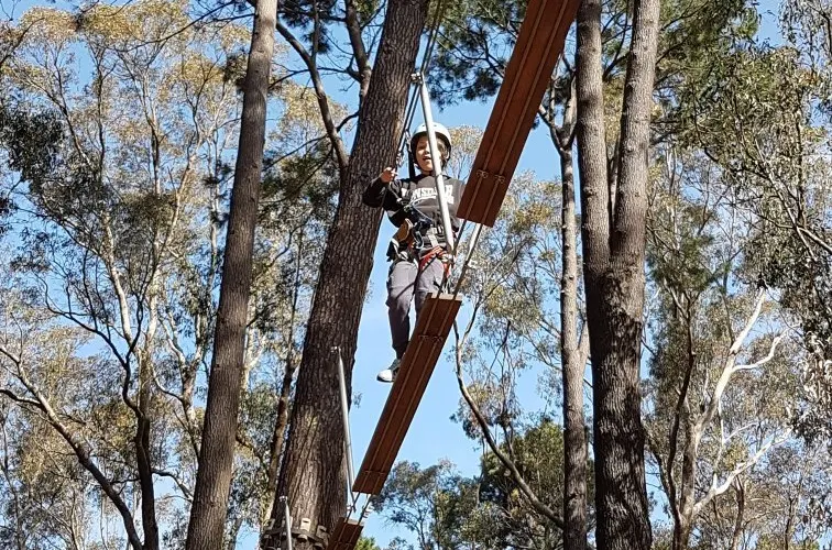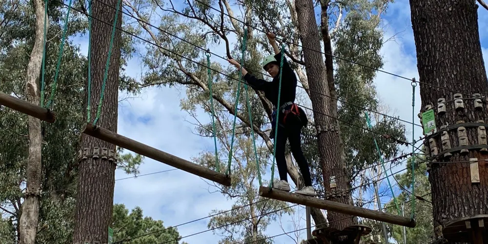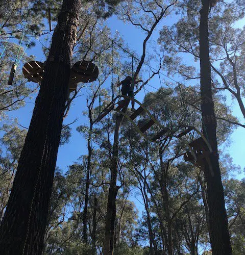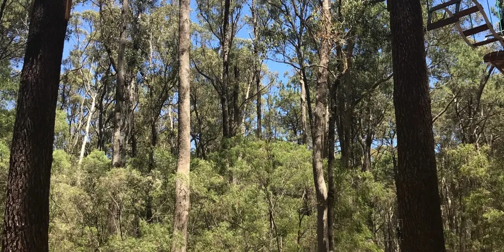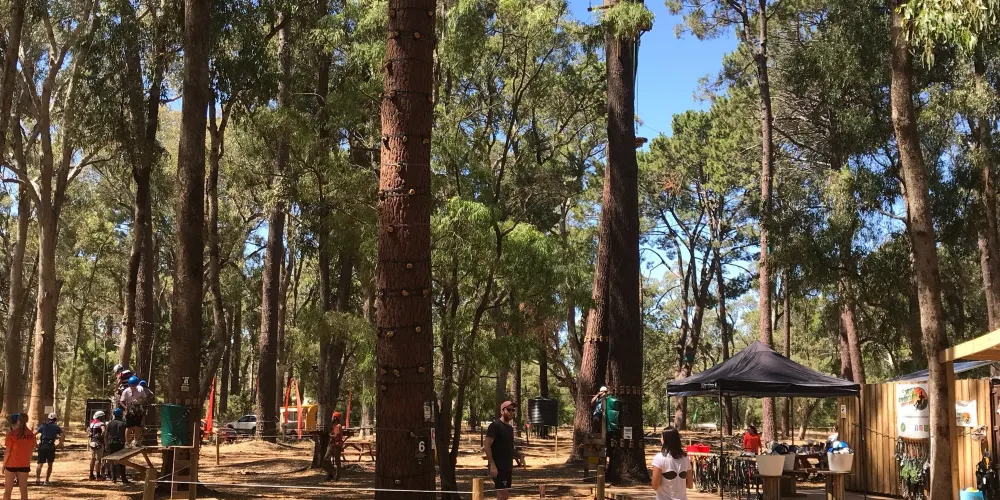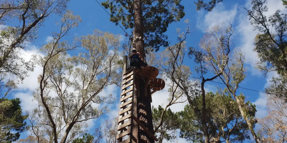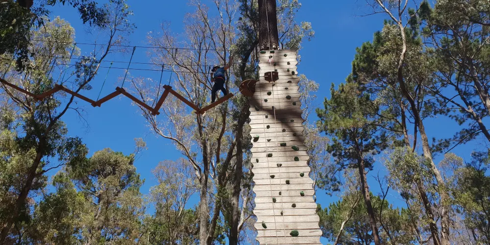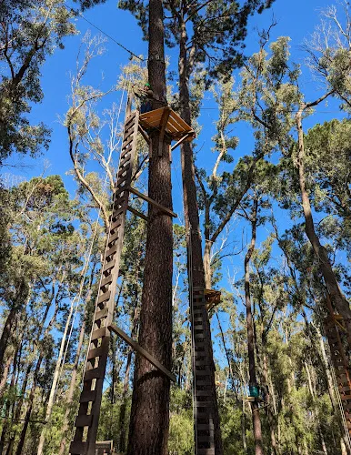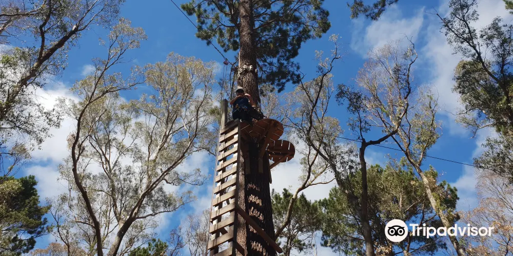 Forest Adventures South West坐落於西澳著名的盧德洛圖雅特森林(Ludlow Tuart Forest)中,距巴瑟爾頓僅約15分鐘車程,佔地8英畝原始灌叢,是澳洲西南部最早引入歐洲高空繩索安全標準的大型樹上探險基地。園區共6條樹冠課程,高度從3米到19米遞進,集合繩橋、搖擺木樁、泰山跳、滑板滑索等70餘項挑戰,其中最長飛索達150米,全部滑索總長超過500米,可讓7歲以上、110厘米至120公斤以內的參與者在2.5小時內盡情穿梭樹梢。每場次始於專業教練的穿裝備講解與低層練習道,確保掌握「一掛一解」安全鎖操作後才可上樹。現場設有儲物櫃、野餐草坪與簡餐小賣部,無論是親子同樂、同學拓展還是公司團建,只要穿上運動鞋、帶好勇氣,就能在這片世界罕見的圖雅特森林頂端體驗「蜘蛛俠」視角,完成自我挑戰並收穫綠意盎然的回憶。