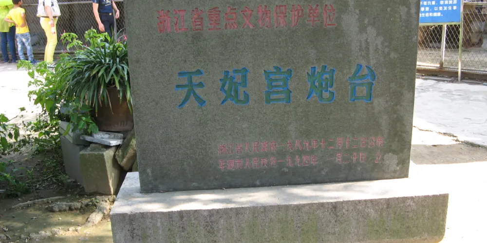 天妃宮炮台位於乍浦鎮湯山公園內。始建於清雍正七年(1729年)。炮台坐北朝南,頻海壘石為基,現尚存面海用塊石壘砌的弧形長廊(長56.3米、寬1.65米)和炮台一組四間,呈扇形南北排列,佔地335平方米。鐵炮三尊,其中中間的鐵炮重7噸,並附有機械傳動裝置,炮身鑄有“江南製造總局光緒甲申年(1884年)造”銘文及團龍紋飾。