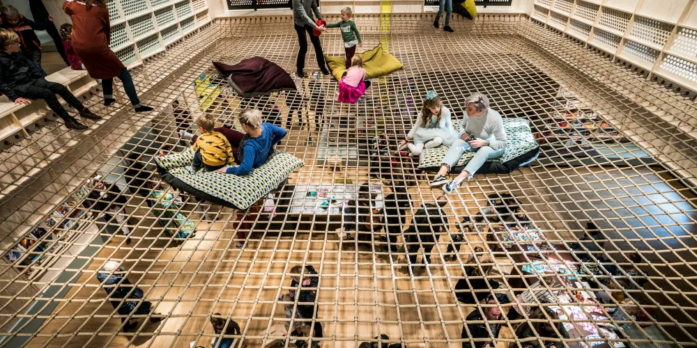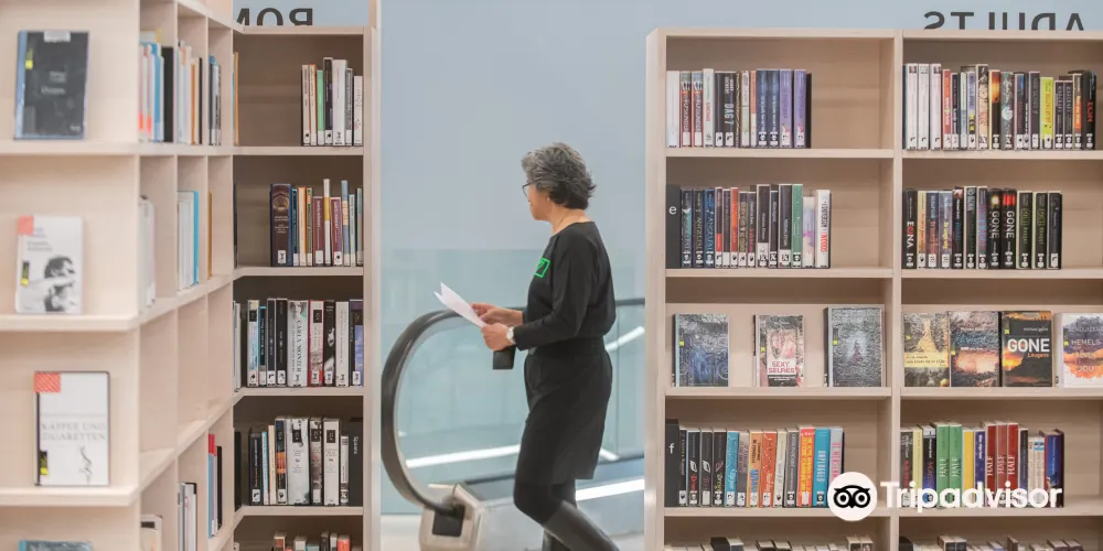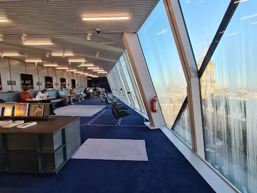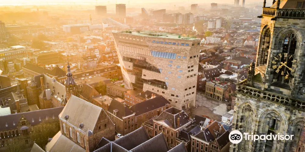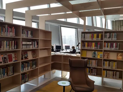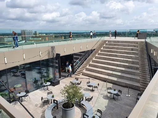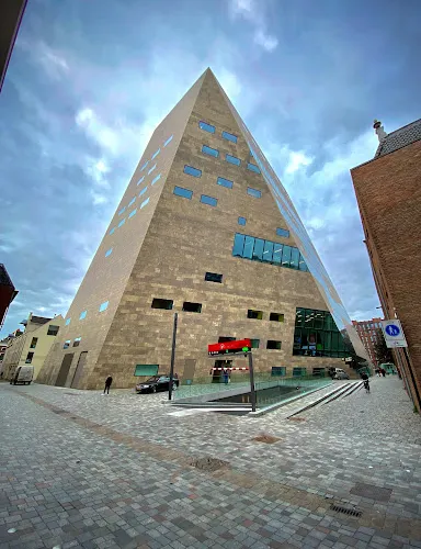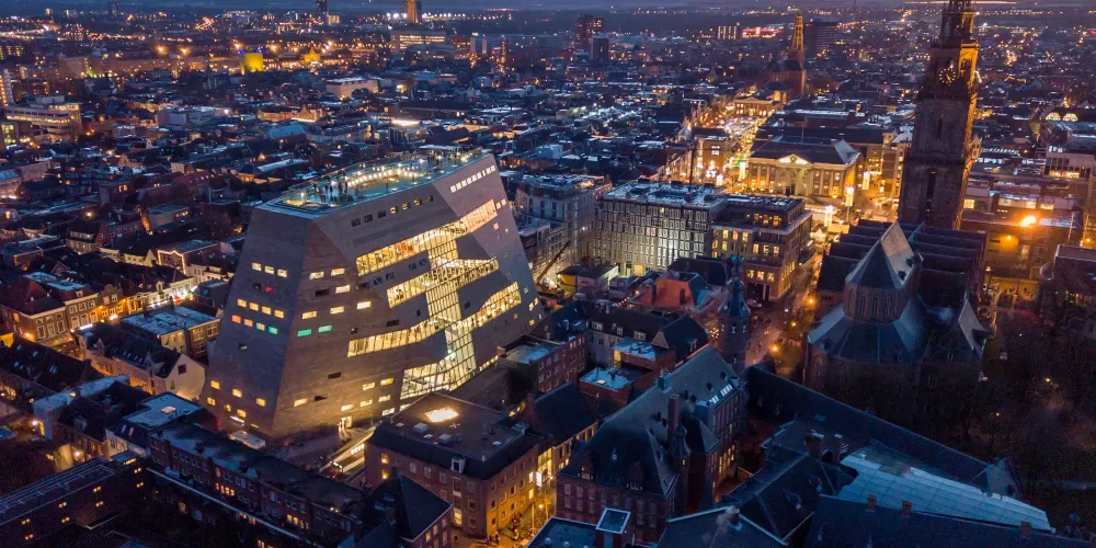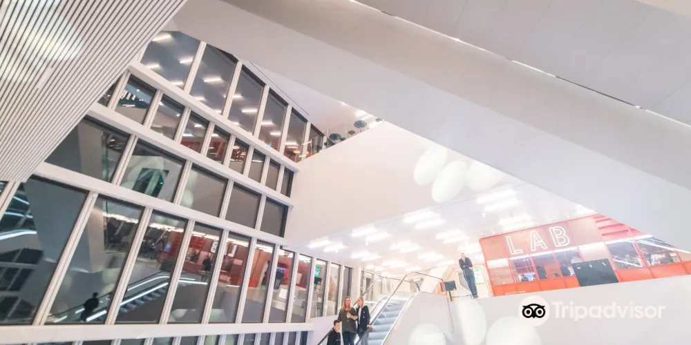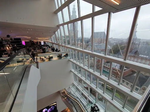 格羅寧根論壇總面積 1.7 萬㎡。建築以「單一清晰體量+切割」為概念,外觀採用本海默砂岩,與舊城色調呼應,內部卻是一座垂直城市:11 層中庭像伸出的觸角,把圖書館、5 個影廳、展廳、屋頂劇場、創客空間、餐廳等全部綁在一起,邊界被故意消解,訊息按主題跨呈現,被稱為「可走進維基媒介」。