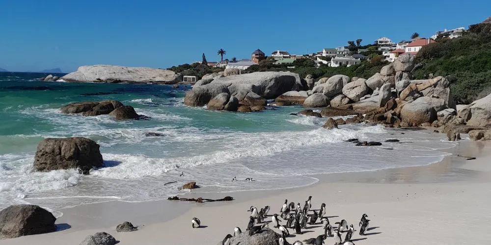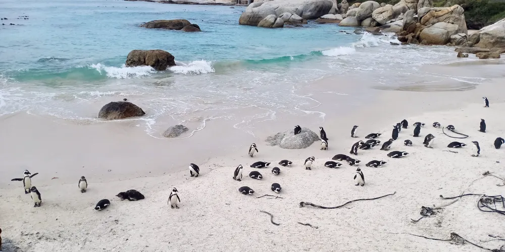 位於南非開普敦東海岸的西蒙鎮中有個被稱為“漂礫”的小海灣,這裡就是南非必遊的景點之一,也是著名的企鵝家園—南非企鵝生態保護區。進入南非企鵝生態保護區之後就是木棧道,兩側都是企鵝的活動範圍,再往裡走就是海灘。而在海灘這裡,就可以看見成片的企鵝們在海水中衝浪、戲水、覓食、或是在沙灘上享受陽光。