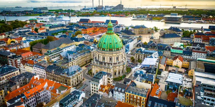 腓特列教堂是丹麥非常大的圓頂教堂,由於大量使用了丹麥及挪威出產的大理石,因此當地人親切地稱之為“大理石教堂”。教堂位於哥本哈根市皇宮廣場對面,與阿美琳堡宮隔道相望。屋內巨大的圓頂上面繪有耶穌的12個使徒的畫像。教堂整個內部的裝飾與繪畫莊重而威嚴,漫步其中,靜靜地欣賞和領略宗教的不朽、莊嚴與神聖。