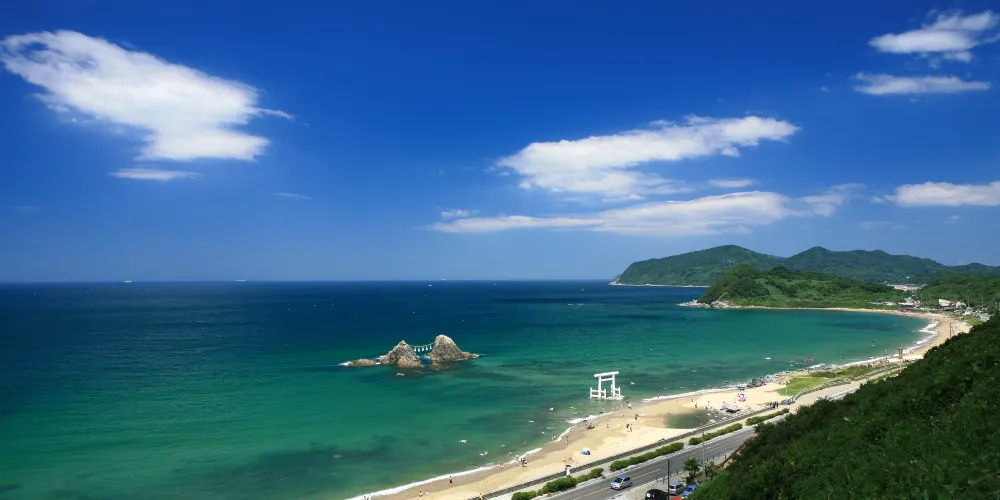 二見浦海灘位於伊勢市東北側海邊,是一片非常寧靜的海灘,海水背後是一片乾淨樸素的民宿,環境優美。這裡是日本有名的海水浴場,歷史上大正天皇還曾在此游泳。二間浦較有名的景觀是正對海岸的兩處水中巖石,兩塊巖石一大一小相互守望,被稱為夫婦巖,當地人用稻草繩將二者連在一起,象徵結緣,這樣兩塊巖石和稻草繩組成的景觀也天然地充當了當地神社的“鳥居”。