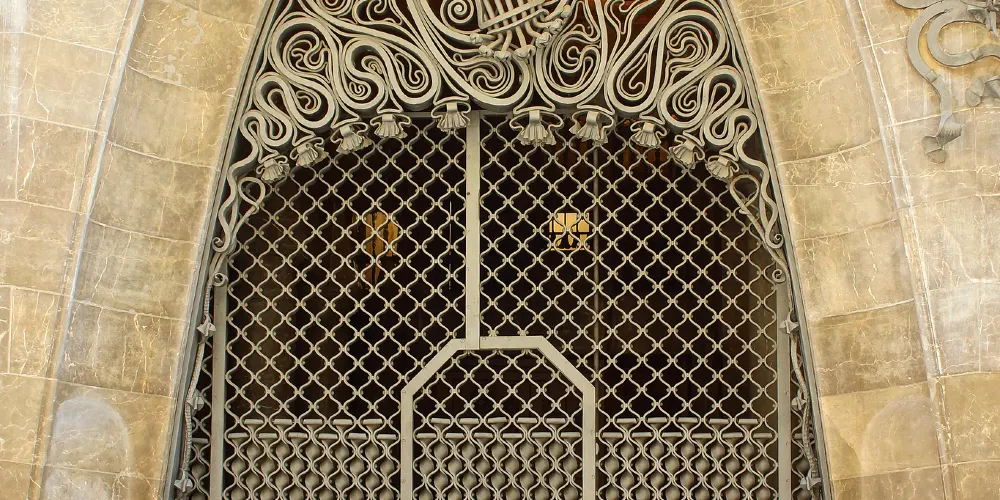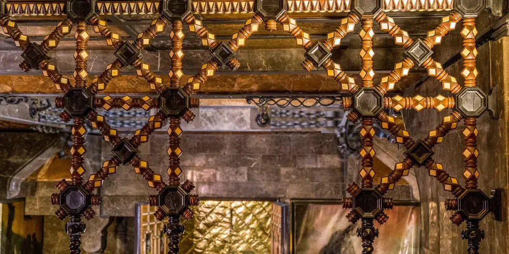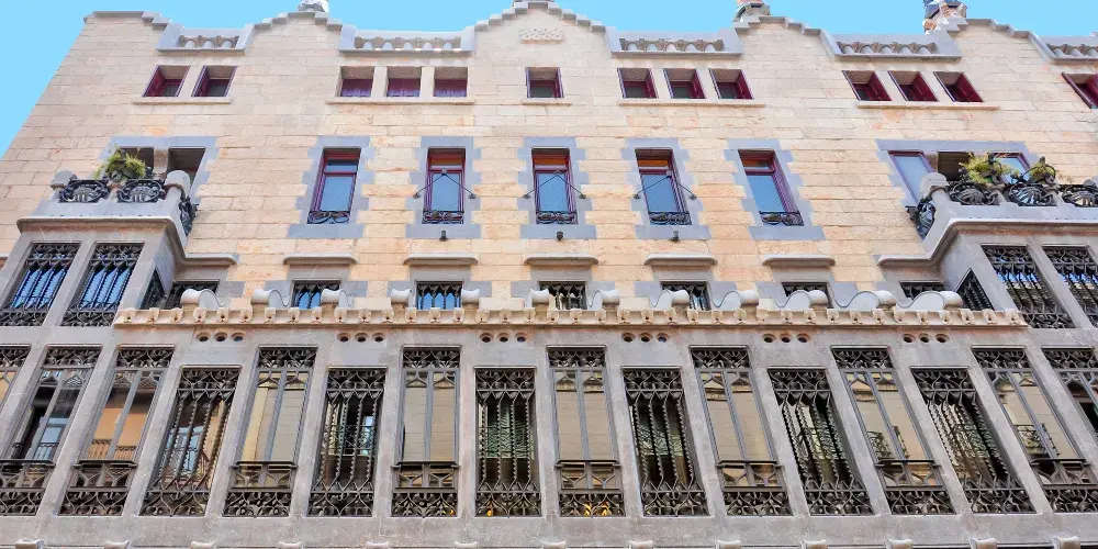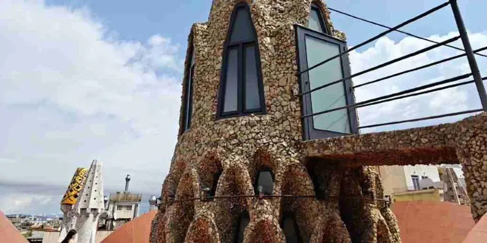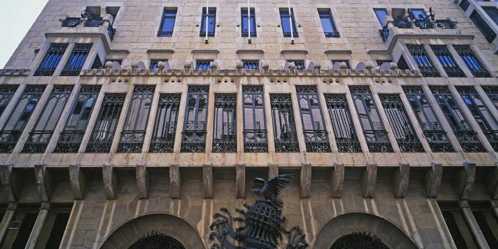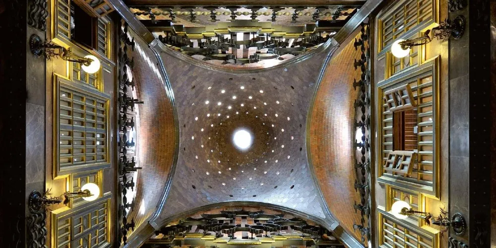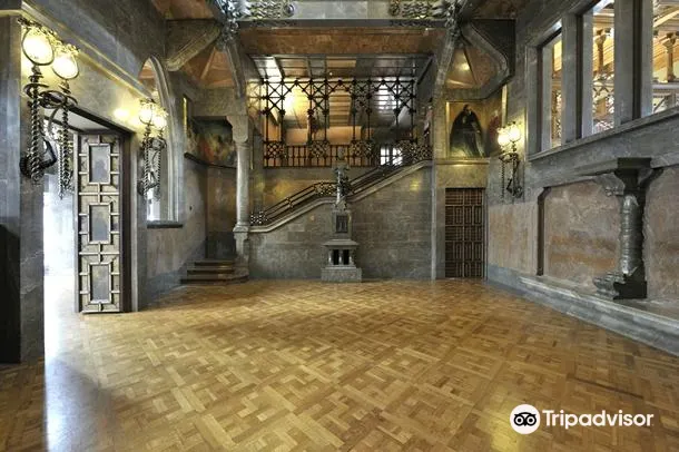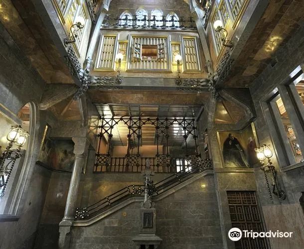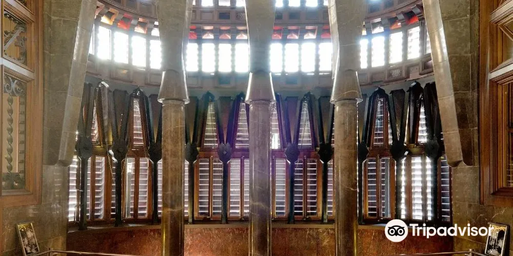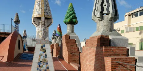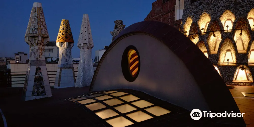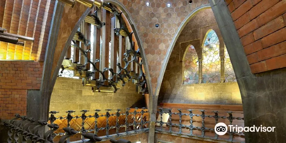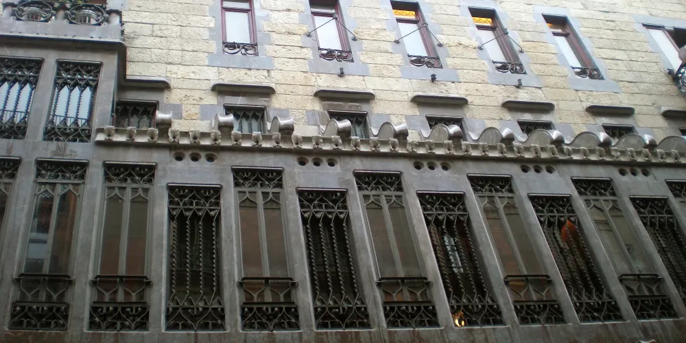 古埃爾宮是高迪1888年所建,也是奠定高迪偉大的氛圍空間創造者地位的作品,1984年被選為世界文化遺產。拱門間以鐵藝鑄造的古埃爾家族徽章氣派非凡。中央大廳的拋物線拱頂設計別具匠心,拱頂和立柱明顯受到阿罕布拉宮的影響。花樣各異的煙囪是其後高迪設計的眾多大膽的煙囪造型的始祖。