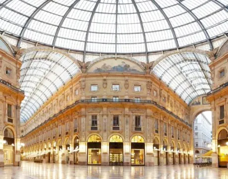 埃馬努埃萊二世拱廊是一個有頂棚的拱廊街,得名於義大利統一後的一位國王埃馬努埃萊二世,這裡被認為是歐洲非常美的商業拱廊之一。拱廊是設計師仿照巴黎古典商業拱廊而建的,兩條交叉的長廊呈十字型,南北長198米,東西長105米,兩條玻璃拱頂的走廊交匯於中部的八角形空間,上方是一個玻璃圓頂。陽光透過玻璃屋頂,照射在底下精緻的浮雕和壁畫上,泛著神聖的金色光芒。雖然在建造之初,米蘭的市民對此方案略有怨言,因為它破壞了部分古建築,但在建成之後卻獲得良好的口碑。如今,拱廊迎接著來自世界各地的觀光客。