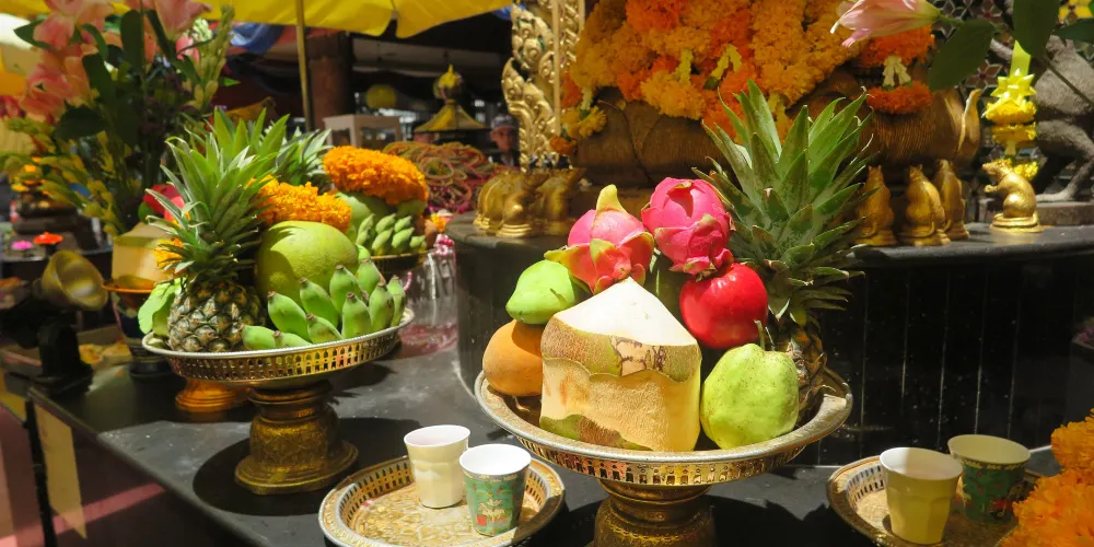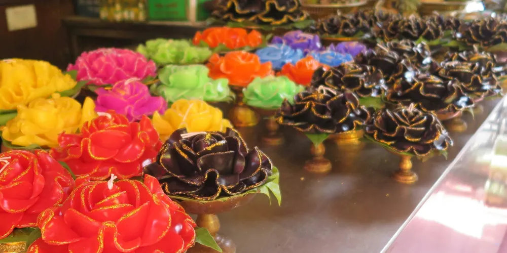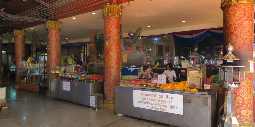 进入四面佛的围栏,右手边有卖烧香用的贡品。拜四面佛要顺时针方向逐面拜。双掌合十,把香夹在两手掌之间,或跪或拜都可以。
