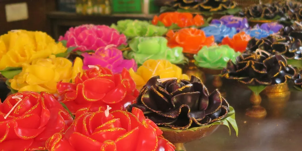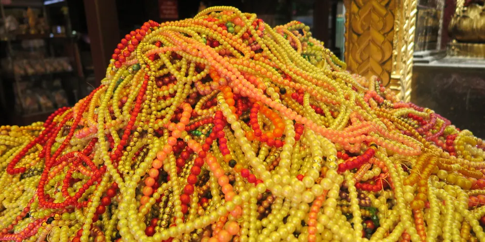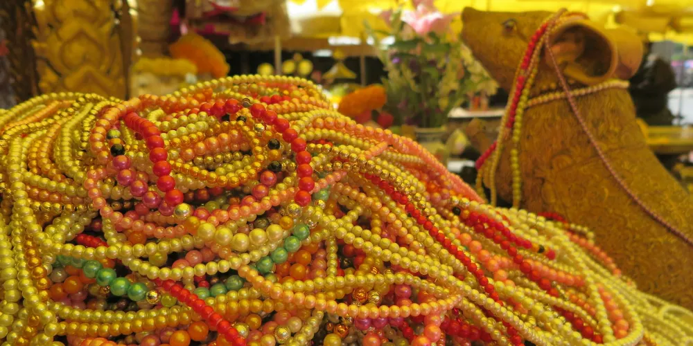 超过一次来拜的人按还愿的方法有另外一套祭品。主要的区别是花环是那种一尺长的大花环,香的颜色也不同。这套还愿用的祭品价位在200泰铢左右,四面佛的还愿者还有一个重要的仪式就是在四面佛旁边的回廊下,请身穿泰国民族服装的舞者为你向四面佛跳一段祈祷和祝福的歌舞