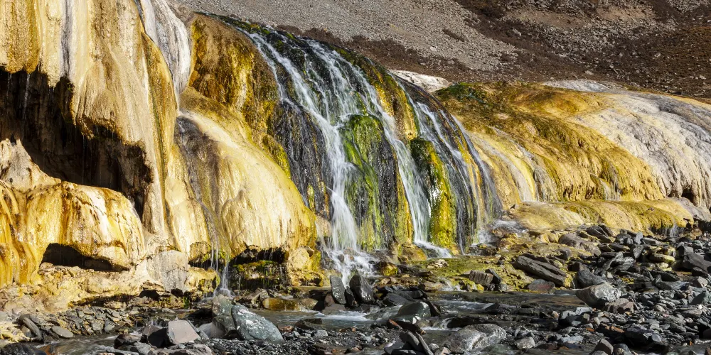 崗什卡七彩冰瀑布是集冰、雪、碎石和巖壁為一體,明暗冰裂縫分佈在冰川之上。夏季來臨時,含有許多種礦物質的水流經過此處便形成了各種色彩的附着物,因此人們稱其為七彩瀑布。