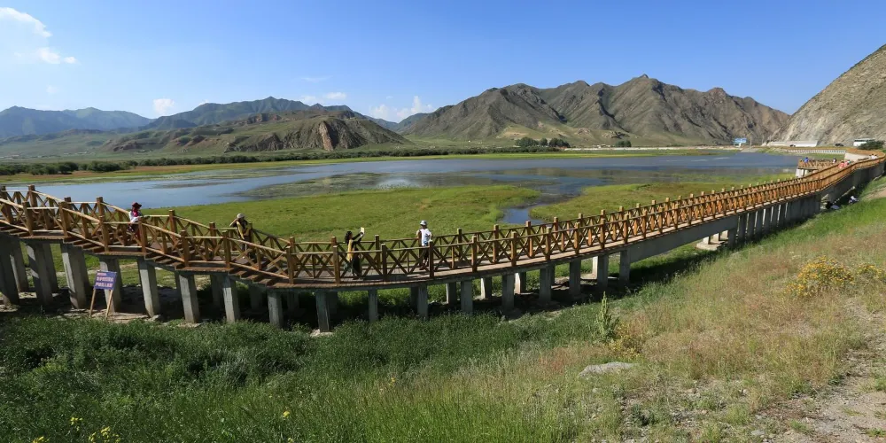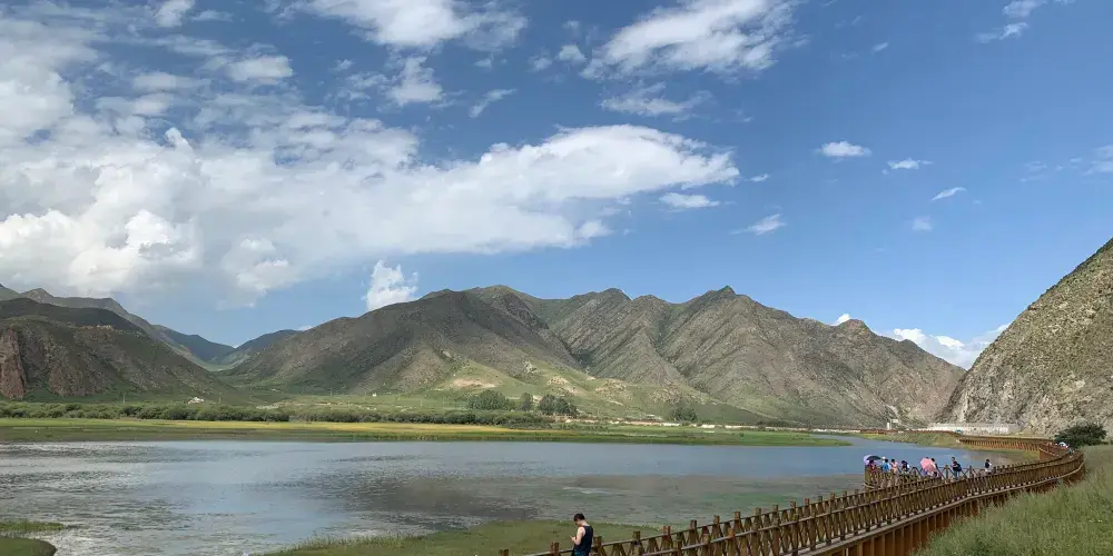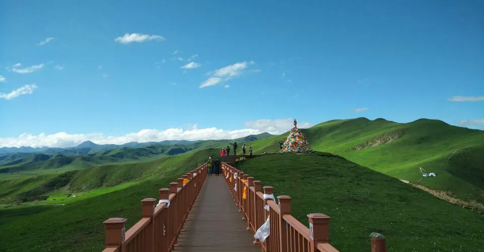 甘加草原位於夏河縣城西北20公里處,它不僅同桑科草原一樣美麗,更多了一份靜謐。草原被羣山環繞,是典型的高原草地,理想的牧場。夏季,整個草原碧綠如茵,好似一塊綠色大地毯,鮮花盛開,繁花似錦。
